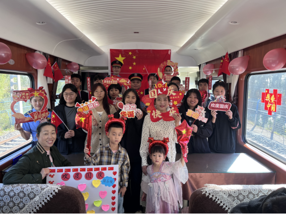 东北网9月29日讯(桑月颖 记者 葛金鑫)为迎庆新中国成立75周年,9月28日,中国铁路哈尔滨局集团有限公司哈尔滨客运段上海车队一组在Z174次列车上开展“祖国母亲,我想对您说”主题活动。列车长贾福全、刘方带领班组乘务人员提前用条幅、国旗将车厢装扮一新,伴随着《歌唱祖国》的乐曲声响彻车厢,旅客们在乘务人员提前准备好的心形便笺纸上写下对祖国母亲的祝福并粘贴在“心愿墙”上,各种“国庆”主题的手持打卡标牌、贴纸、气球更是让车厢里的喜庆氛围拉满,大家一同唱响对祖国生日的美好祝愿,纷纷用手机拍照记录这特别而难忘的瞬间。