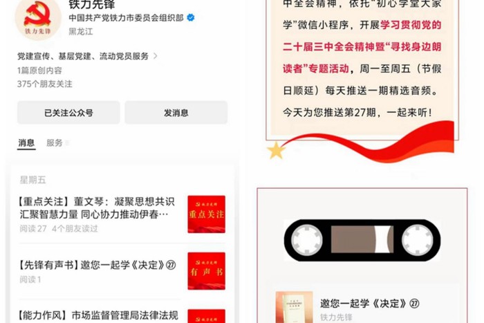 立足“学”,持续整合优质学习教育资源。铁力市依托铁力市委组织部官方微信公众号“铁力先锋”,通过设置“工作经验”“工作动态”等系列专栏,及时发布宣传各级党组织典型案例和优秀党员先进事迹,全面展示基层一线工作动态,激发党员干部干事创业热情。持续推出“组工课堂”“应知应会”等学习专栏,通过刊发理论文章、学习心得等方式,让“云课堂”撑起党员教育大舞台。创新开设“先锋有声书”专栏,一起学习《中共中央关于进一步全面深化改革推进中国式现代化的决定》,获得了广大党员干部群众的一致好评,真正让“微课堂”发挥了“大作用”。目前,累计发布各类信息1600余条,浏览人数达16万余人次。