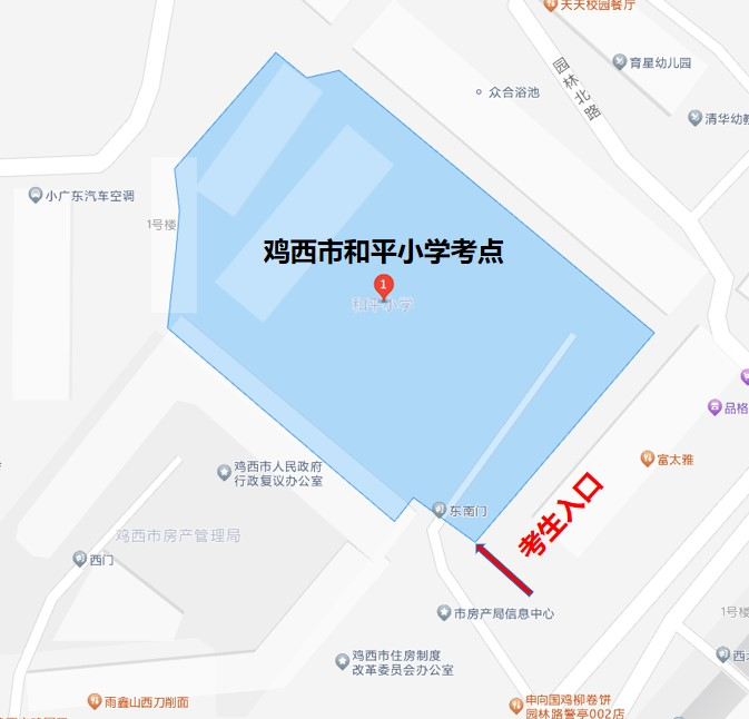 考点为鸡西市和平小学的考生可乘坐138路、14路、2路,到新华书店公交站下车,沿和平北大街向北步行377米,到达鸡西市和平小学或乘坐88路,到园林路西公交站下车,沿园林西路步行103米到达鸡西市和平小学。
