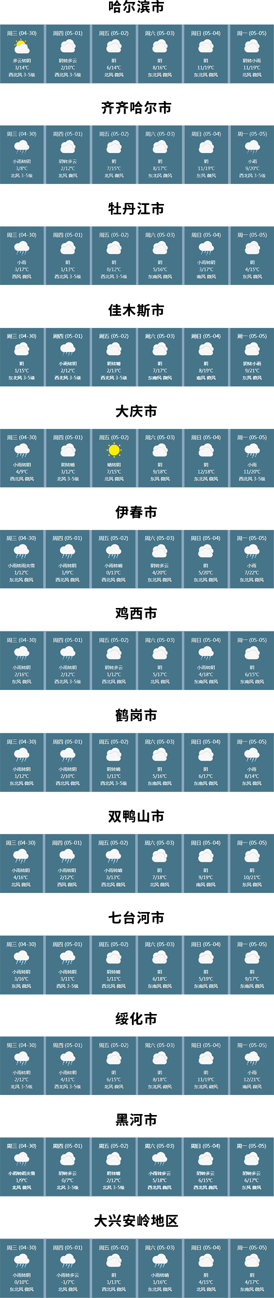 根据天气预报分析,2025年“五一”期间黑龙江省各地天气以多云为主,气温在2℃至12℃之间,部分地区可能出现小雨。哈尔滨、齐齐哈尔、牡丹江等地区需重点关注天气变化对路网运行的影响。