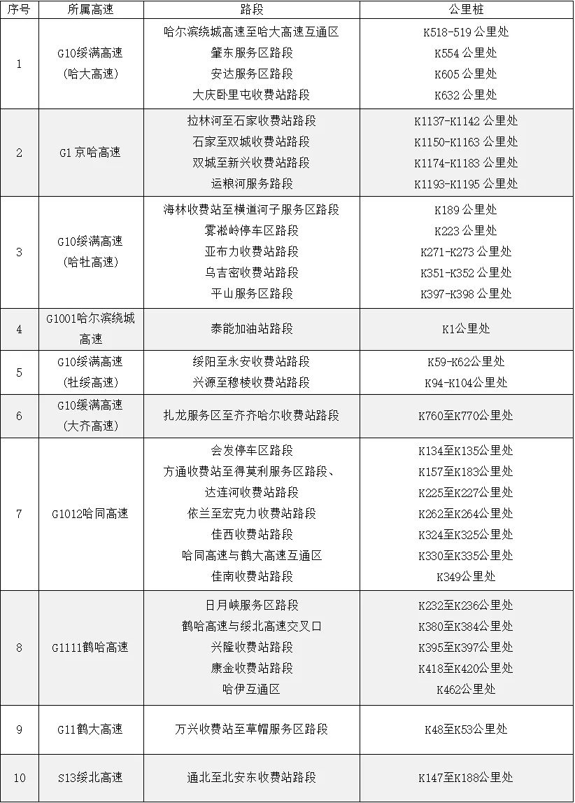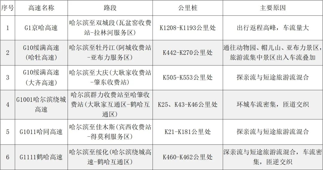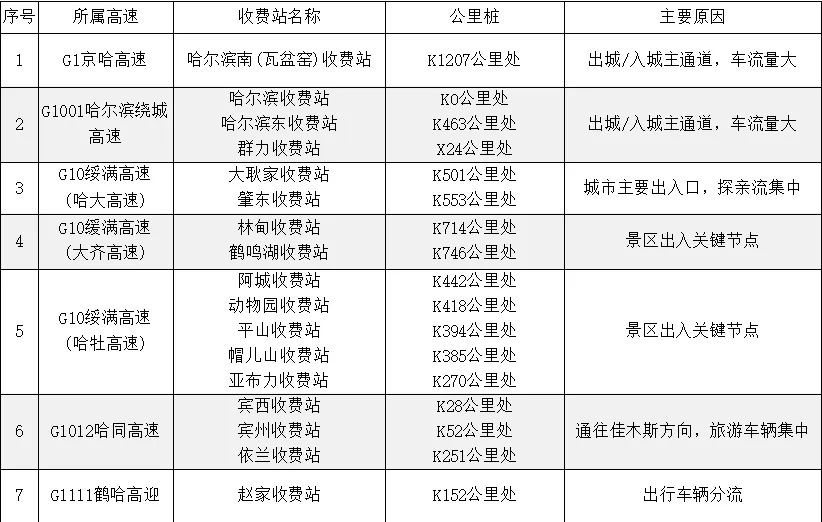 出行车辆以小型自驾车、中短途为主,哈尔滨、齐齐哈尔、牡丹江等市区周边收费站、服务区和景区车流量将会略有增长。