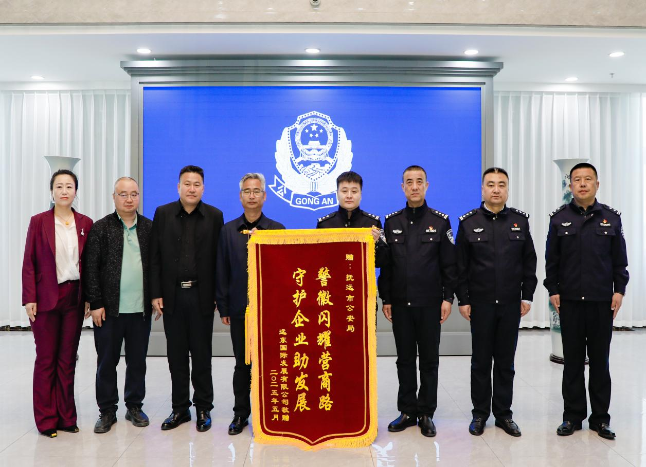 5月16日,抚远市远东国际发展有限公司负责人将一面印有“警徽闪耀营商路,守护企业助发展”的锦旗送到抚远市公安局。