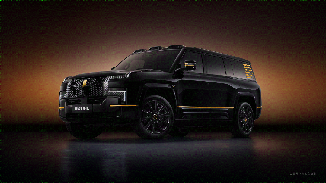 车展上,仰望全新打造的全尺寸行政豪华SUV仰望U8L迎来“鼎”级上新,首发曜石黑配日珥金全新车色将两种极具象征意义的色彩融为一体。·