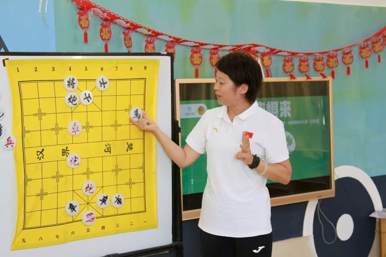 “小朋友们,知道这棋盘上的‘楚河汉界’背后藏着怎样的故事吗?”课堂伊始,张梅大师便以生动有趣的提问引发了孩子们的好奇心。不同于传统的教学模式,张梅大师将象棋知识与童话故事相结合,用拟人化的语言介绍“将、士、象、马、车、炮、兵”等棋子的走法:“‘马’宝宝走路最爱走‘日’字步,就像小跳蛙一样蹦蹦跳跳;‘炮’将军打敌人要翻山哦……”亲切的讲解搭配形象的肢体动作,瞬间点燃了孩子们的学习热情,原本对象棋一无所知的小朋友们纷纷睁大眼睛,听得津津有味。