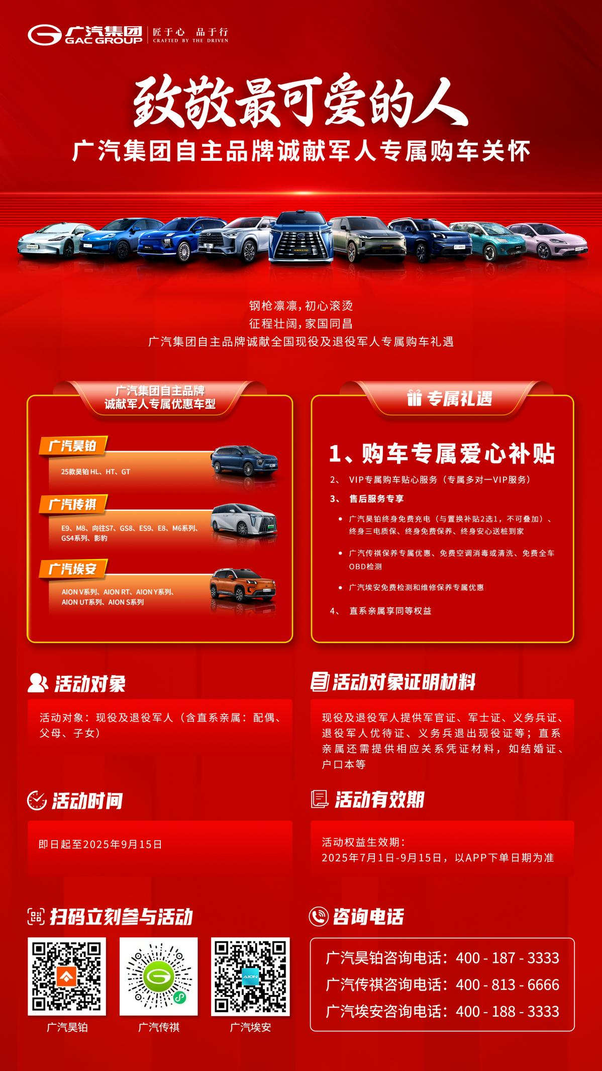 即日起至9月15日,广汽集团推出军人专属购车关怀活动,覆盖旗下昊铂、传祺、埃安三大自主品牌全系车型。活动面向全国现役军人、退役军人及直系亲属(配偶、父母、子女)。