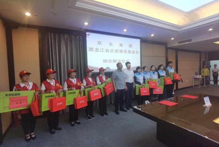 签约仪式现场,省委社会工作部、省商务厅向京东集团赠送黑龙江省志愿者马甲和志愿服务徽章。京东集团、黑龙江省志愿服务基金会分别向参加签约仪式的志愿者代表赠送志愿服务有关物资。
