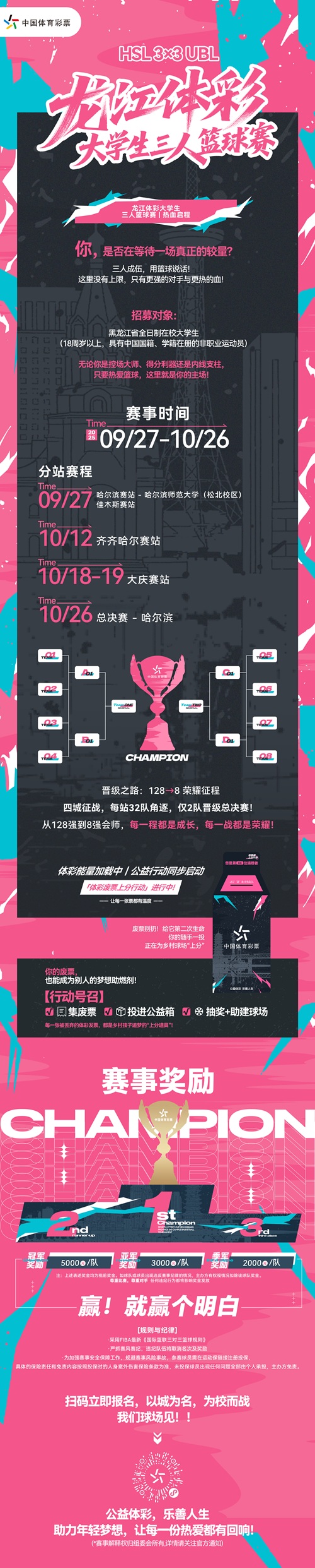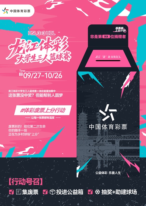 作为赛事主办方,龙江体彩始终秉持?“公益体彩,乐善人生”?的理念,将体育赛事与公益行动深度绑定。你的每一记投篮、每一次冲刺,都在为龙江体育公益事业添砖加瓦!