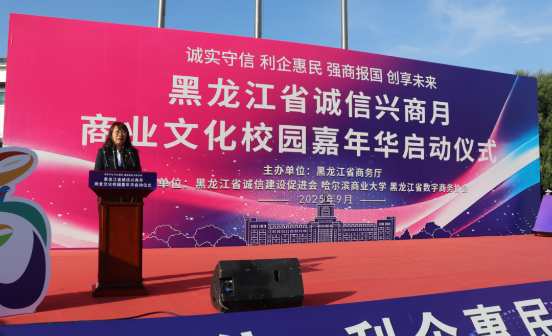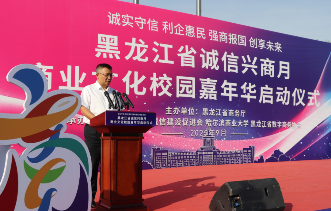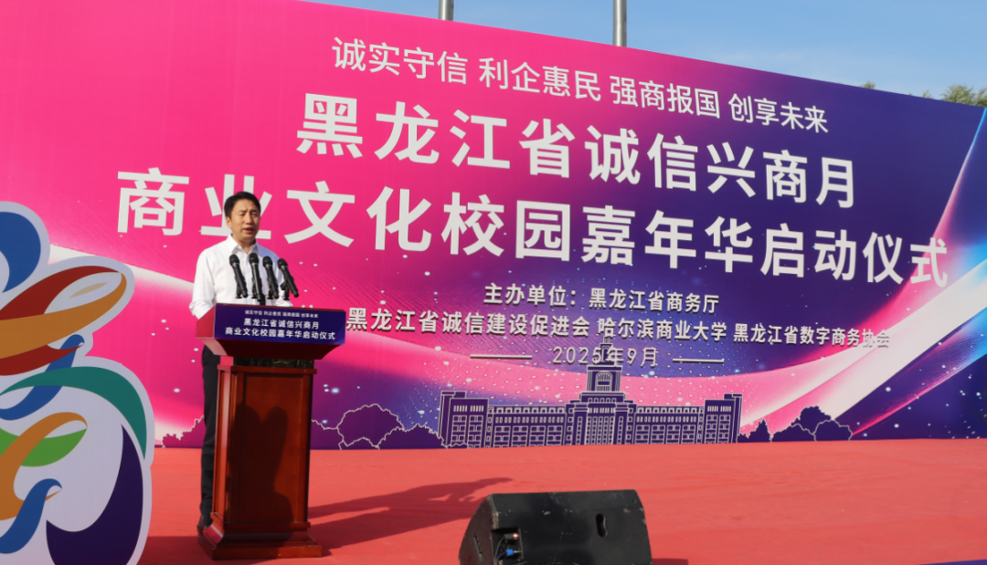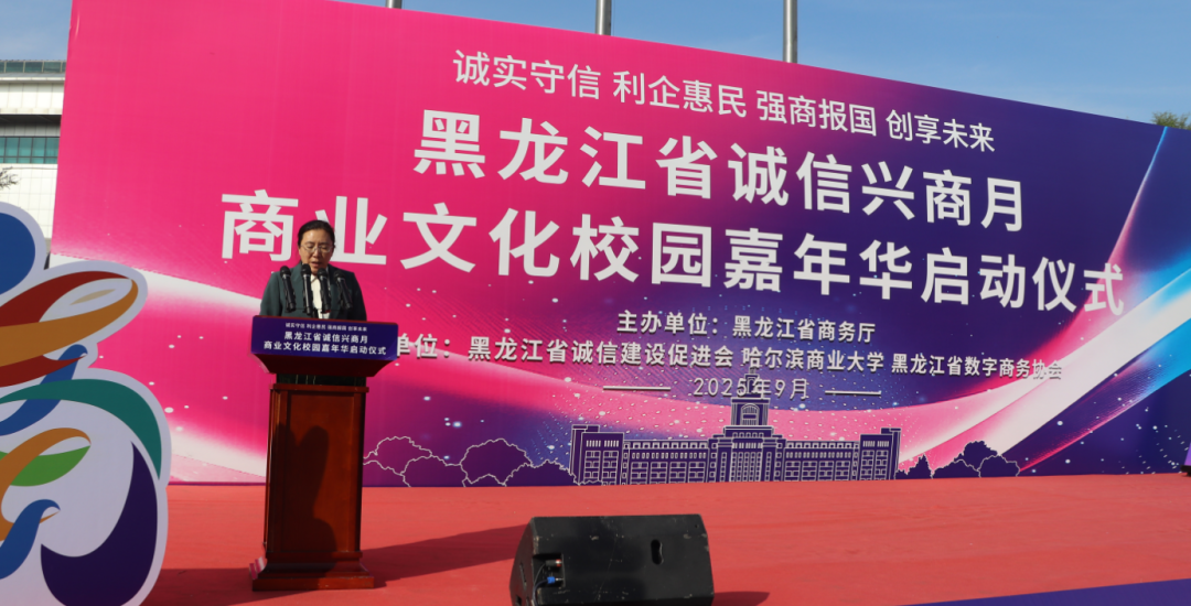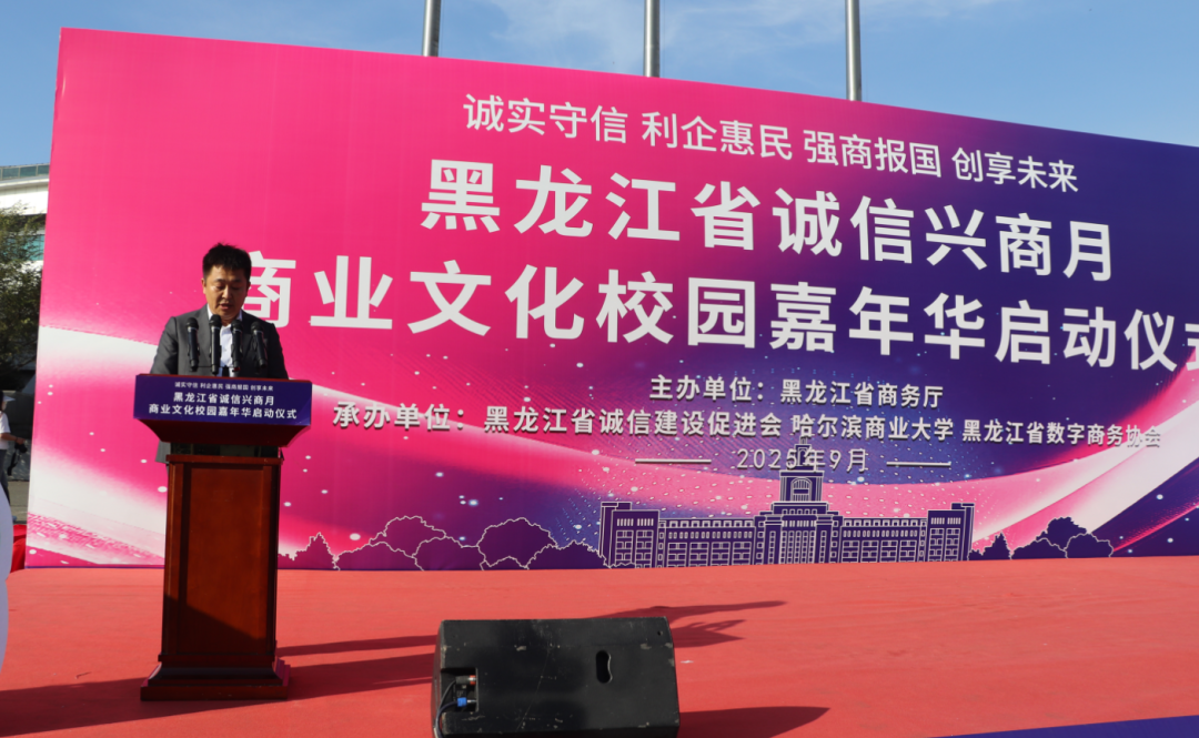 2025年9月23日,由黑龙江省商务厅主办,黑龙江省诚信建设促进会、哈尔滨商业大学、黑龙江省数字商务协会共同承办的黑龙江省2025年"诚信兴商宣传月"启动仪式在哈尔滨商业大学江北校区隆重举行。省商务厅二级巡视员孙广智、省工信厅二级巡视员常卫东、省贸促会二级巡视员王山红,省委宣传部、省高级人民法院、省营商局、省交通厅、省文旅厅、省国资委、哈尔滨海关、省市场监管局、省税务局、省广播电视局、省外汇管理局等诚信兴商宣传月活动联合举办部门;省委社会工作部、省教育厅、省民政厅、省工商联、市工商联、省社会保障行业协会联合党委等有关部门;诚信兴商联盟成员单位、省老字号企业、文旅企业、二手车企业、行业商协会的代表,师生代表近400人出席活动。
