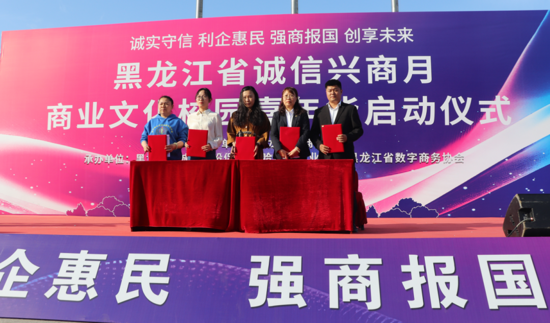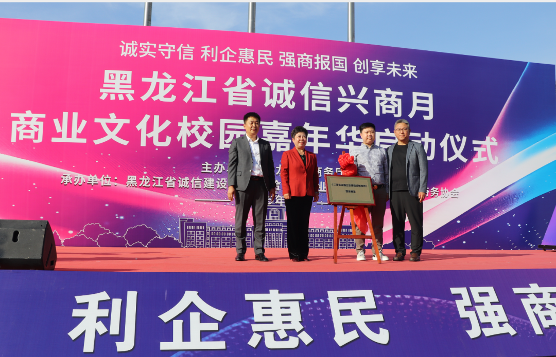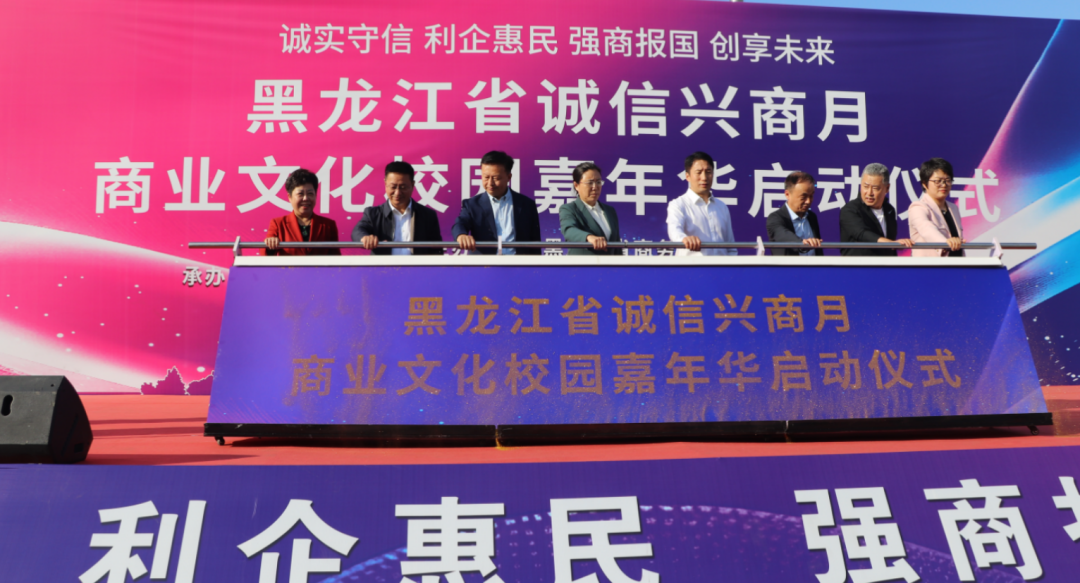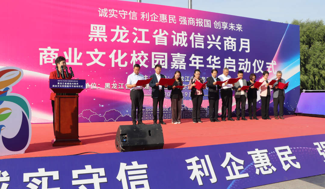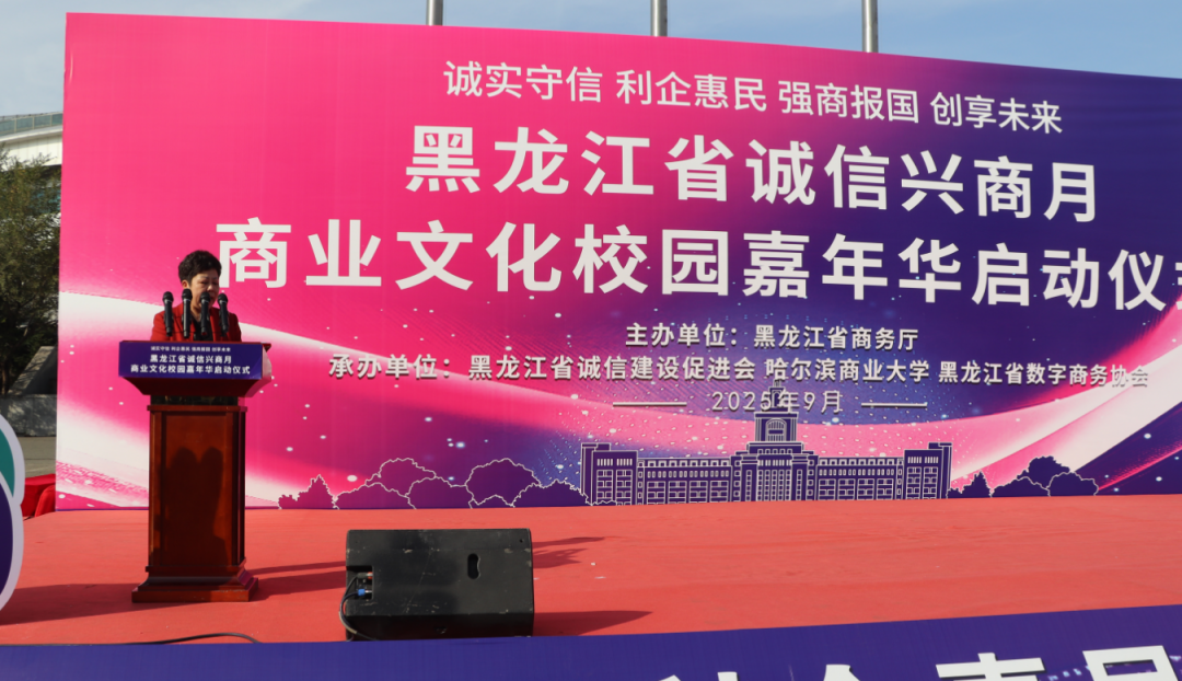 2025年9月23日,由黑龙江省商务厅主办,黑龙江省诚信建设促进会、哈尔滨商业大学、黑龙江省数字商务协会共同承办的黑龙江省2025年"诚信兴商宣传月"启动仪式在哈尔滨商业大学江北校区隆重举行。省商务厅二级巡视员孙广智、省工信厅二级巡视员常卫东、省贸促会二级巡视员王山红,省委宣传部、省高级人民法院、省营商局、省交通厅、省文旅厅、省国资委、哈尔滨海关、省市场监管局、省税务局、省广播电视局、省外汇管理局等诚信兴商宣传月活动联合举办部门;省委社会工作部、省教育厅、省民政厅、省工商联、市工商联、省社会保障行业协会联合党委等有关部门;诚信兴商联盟成员单位、省老字号企业、文旅企业、二手车企业、行业商协会的代表,师生代表近400人出席活动。