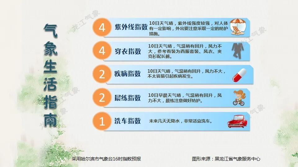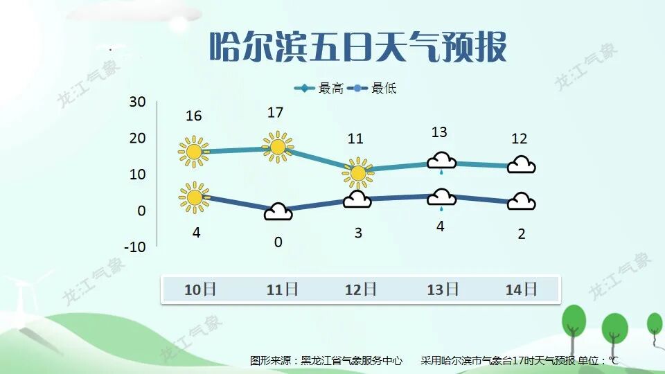 10日白天最高气温:大兴安岭7~9℃,黑河、伊春北部、鹤岗、七台河、鸡西11~13℃,其它地区14~16℃。