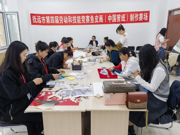 比赛现场,鱼皮画(中国剪纸)制作、桦树皮工艺画制作两项赛事同步进行,参赛选手以鱼皮为纸、以剪刀为笔,将创作灵感融入指尖技艺,一幅幅满载赫哲族先民捕鱼场景、抚远自然风光的作品跃然而生,尽显匠心传承。“赫哲族鱼皮画师”劳务品牌骨干成员宋冬梅在该项赛事中获得第一名。