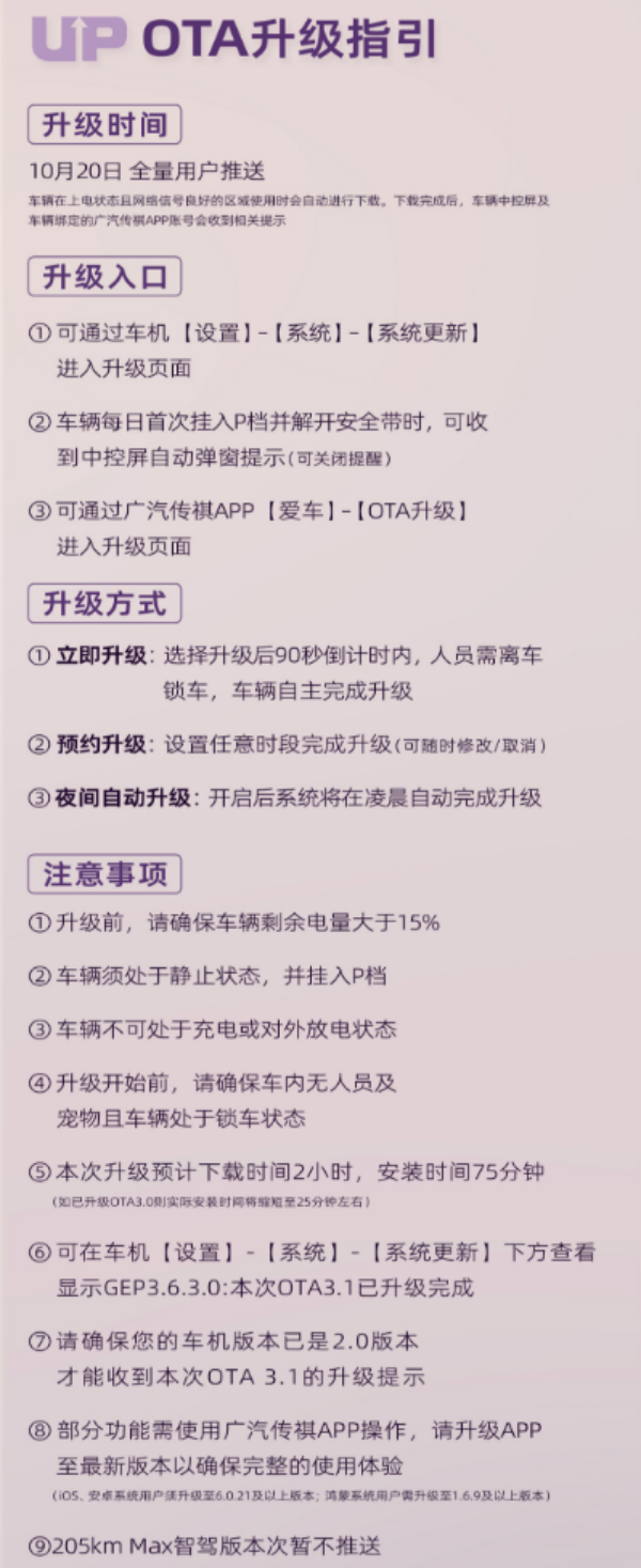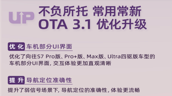 10月20日,传祺向往S7面向全量用户正式推送OTA 3.1版本升级。这次更新优化了Pro版、Pro+版、Max版、Ultra四驱版车型的车机部分UI界面,让交互更加直观清晰;还提升了弱信号场景下的导航定位准确性,就算开去山区、隧道这些信号薄弱的地方,也不用担心导航“迷路”。不仅让车主轻松拥有靠谱的智能驾驶辅助,更通过高频OTA实现“常用常新”。