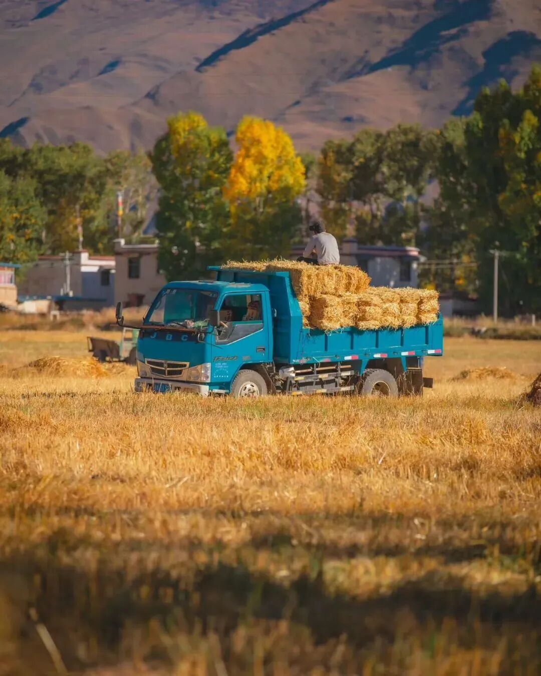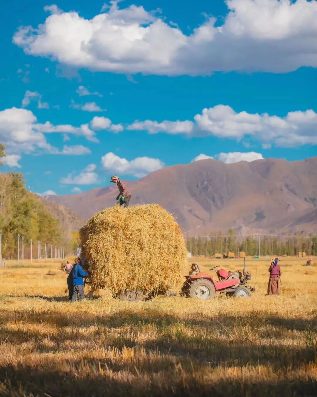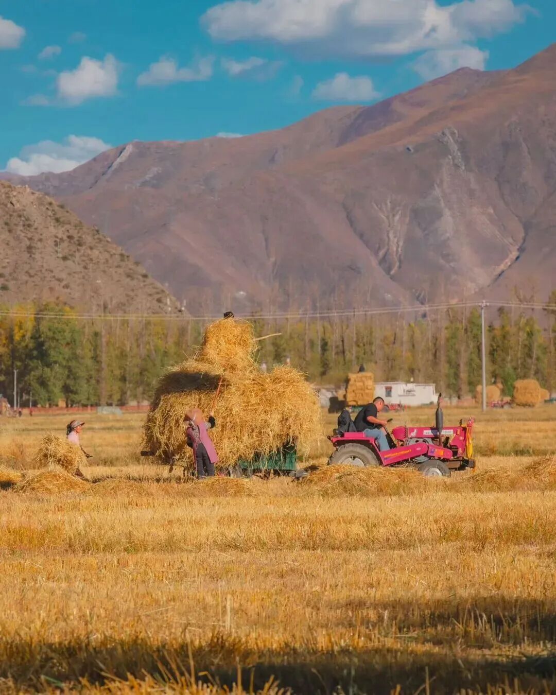 青稞草垛与密匝树林的相配