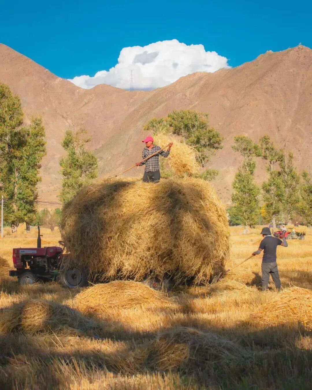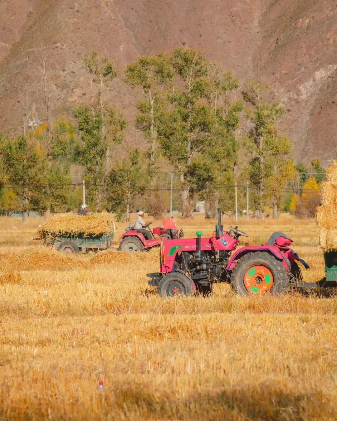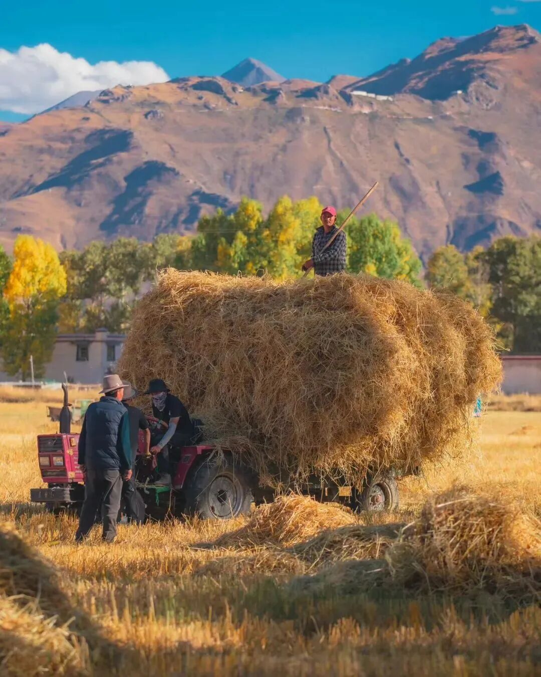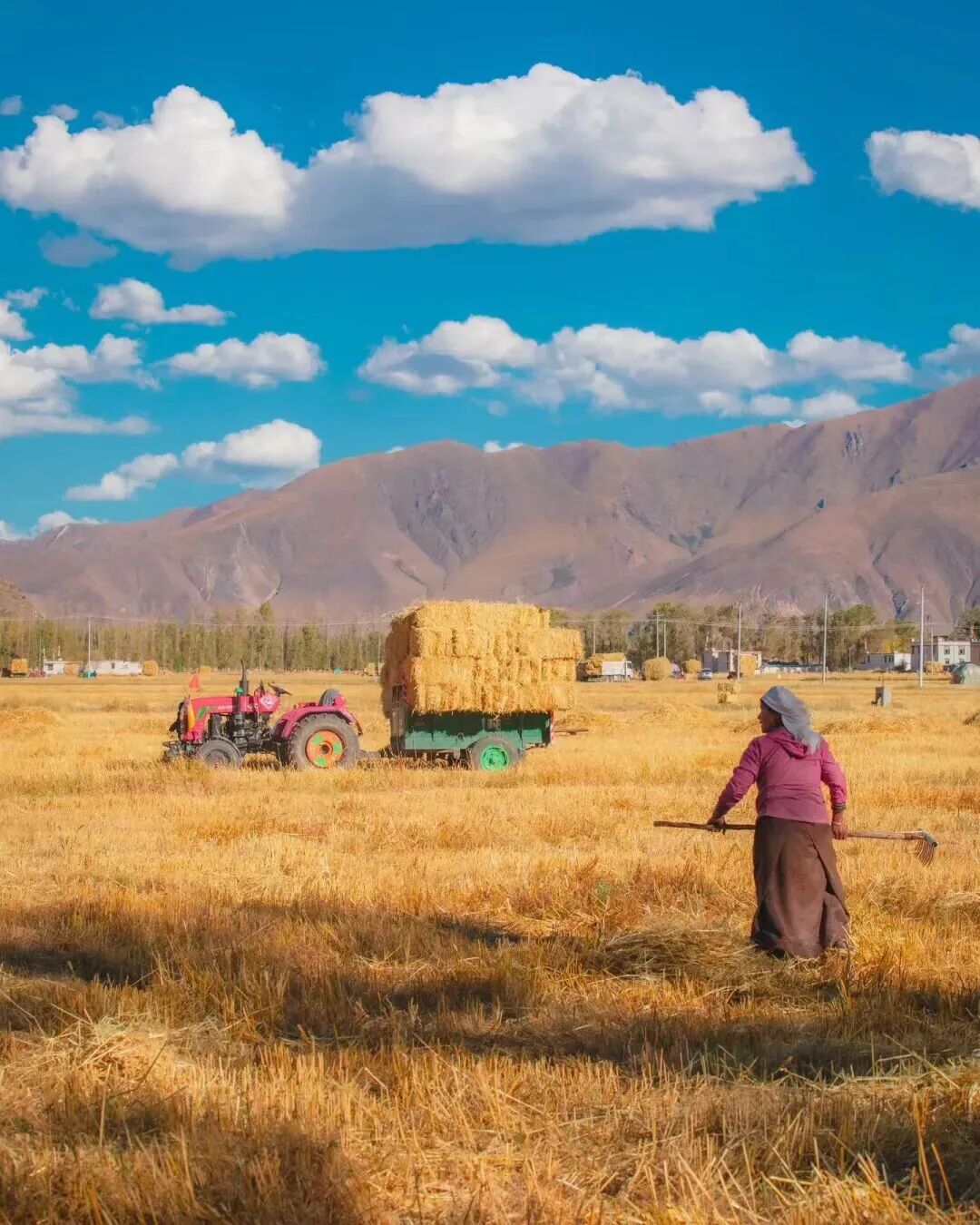 青稞草垛与密匝树林的相配