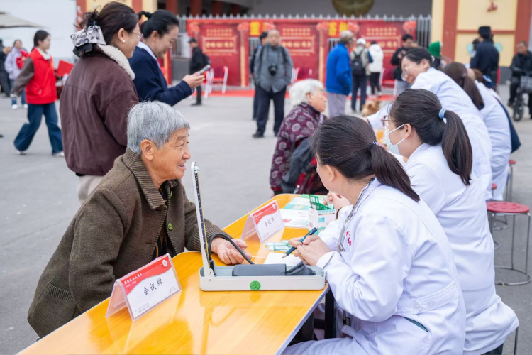 一旁的义诊台前,老人们有序排队,进行血压、血糖测量和健康咨询。医生们耐心解答,并针对秋季常见病提出预防建议。