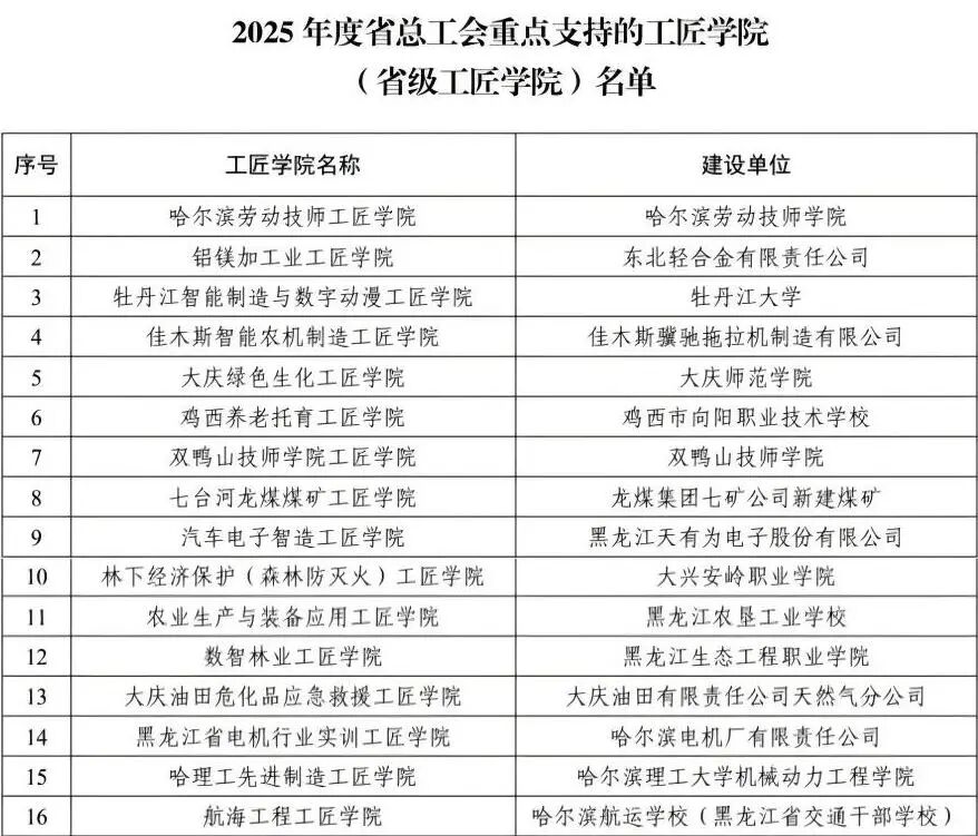 为扎实推进我省产业工人队伍建设改革,持续深化技能人才培养体系,助力构建“4567”现代化产业体系,近日,按照《龙江工匠学院体系建设三年行动方案(2024—2026年)》有关要求,经单位申报、资格审核、会议审议等程序,省总工会确定哈尔滨劳动技师学院等16家工匠学院为2025年度重点支持工匠学院(省级工匠学院)。