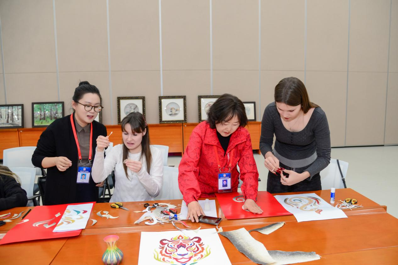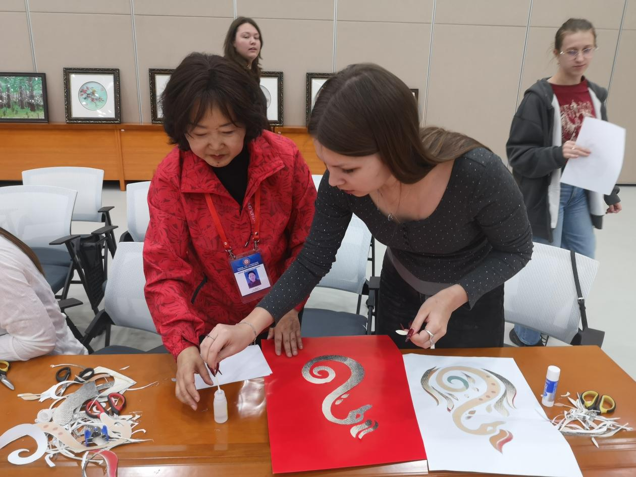 活动现场,王桂荣精心准备了凝聚赫哲族智慧的鱼皮画作品在非遗展示区展示。同时,她还手持刻刀现场演示并讲解了制作过程,来自俄罗斯的留学生们在王桂荣指导下,首次尝试裁剪鱼皮纹样,体验来自东极抚远的非遗技艺。