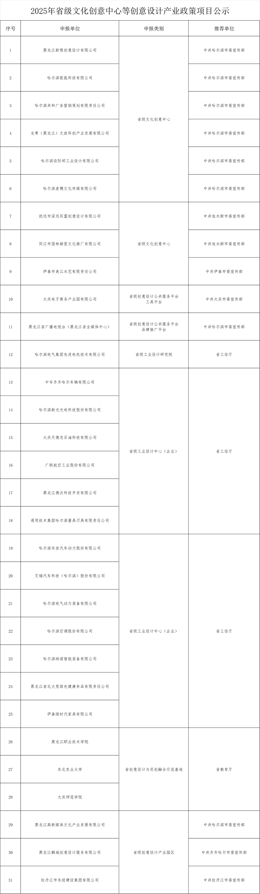 根据《黑龙江省支持创意设计产业发展若干政策措施》 《黑龙江省创意设计产业发展专项资金管理办法》《黑龙江省支持创意设计产业发展政策措施操作规程》要求,经申报受理、材料审核、联合评审,现将通过评审的项目予以公示(名单详见附件)。