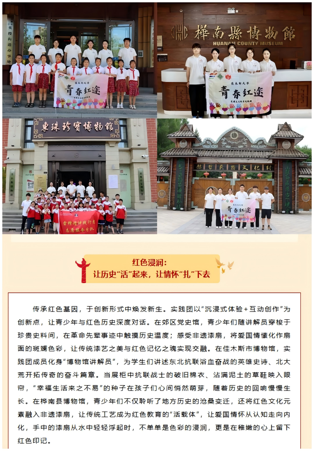 依托佳木斯底蕴深厚的红色文化资源,深入挖掘东北抗联精神、北大荒精神等红色文化核心要义,将红色文化育人理念深层次融入思政教育课前预习、课堂讲授、课后拓展各环节。通过红色经典诵读、红色研学寻访、红色故事宣讲等丰富多样的形式,将佳木斯红色历史印记、红色精神传承等鲜活文化元素有机融入教学全过程,构建起全方位、立体化的红色思政育人网络,引导学生在红色文化的滋养中筑牢精神之基,在红色精神的感召中勇担时代使命,为区域发展与国家建设注入青春力量。