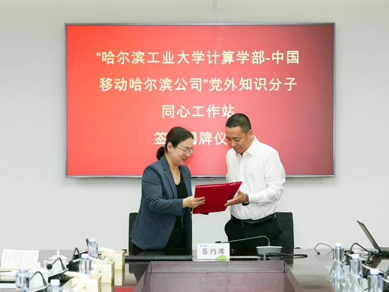 近日,中国移动哈尔滨公司(以下简称“哈尔滨移动”)与哈尔滨工业大学计算学部(以下简称“哈工大计算学部”)党外知识分子“同心工作站”签约揭牌仪式在哈尔滨移动隆重举行。哈尔滨移动总经理孟繁力、副总经理宫剑飞及相关部门负责人,哈工大党委统战部常务副部长苑颖,计算学部党委书记单既阳、主任助理王莘及党外教师代表共同出席仪式,见证校企统战工作与创新合作深度融合的重要时刻。