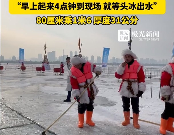 松花江“头冰”原来在这呢!“早上起来4点钟到现场,冰槽早就开好了,就等头冰出水”