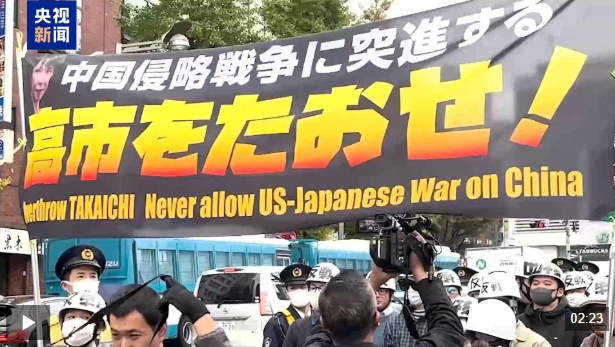 抗议者:我们绝不能原谅高市首相的发言。日本首相在国会中以官方见解发表那样的言论,这不仅是高市个人的问题,我认为这是日本政府再次对中国、对亚洲发动侵略战争的宣言。