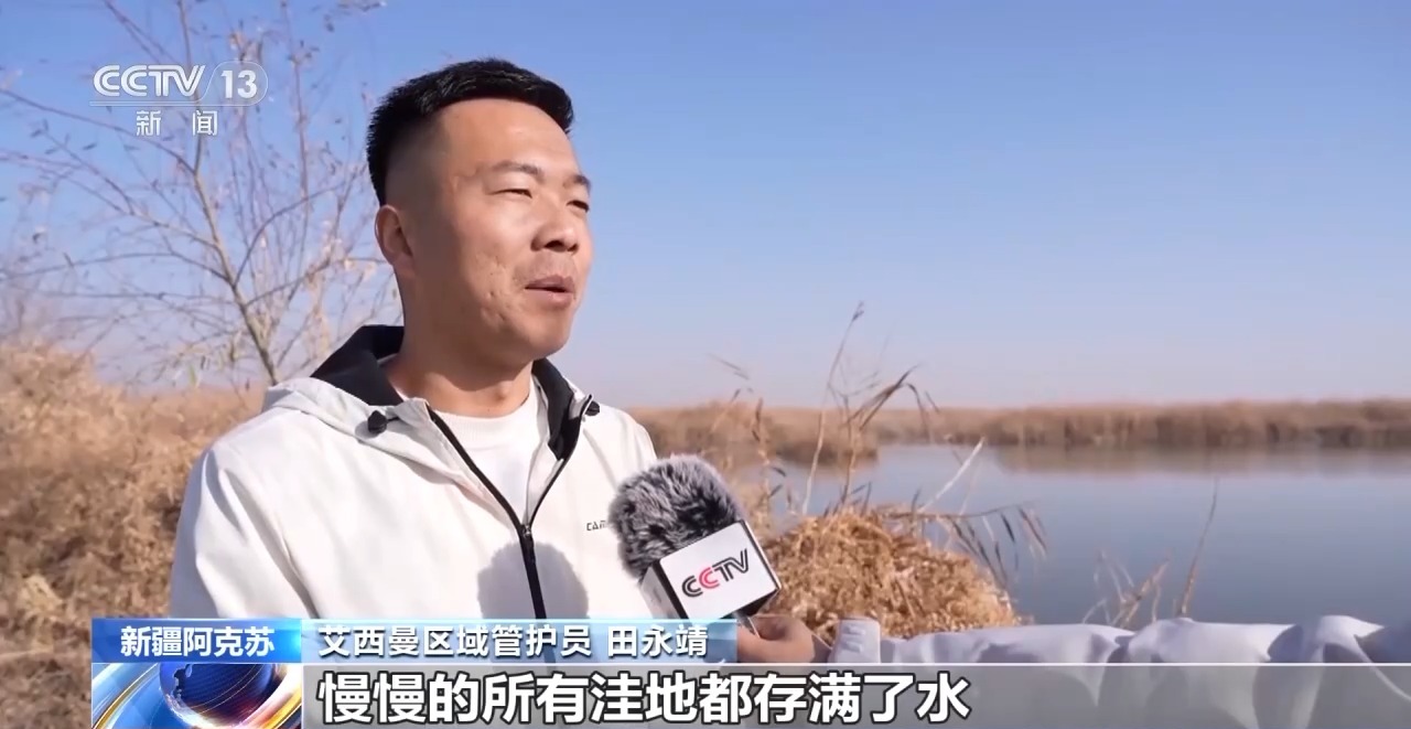 艾西曼区域管护员田永靖:再生水过来之后,慢慢所有洼地都存满了水,变成了现在所看到的湿地,这一大片的芦苇现在长势都特别不错。