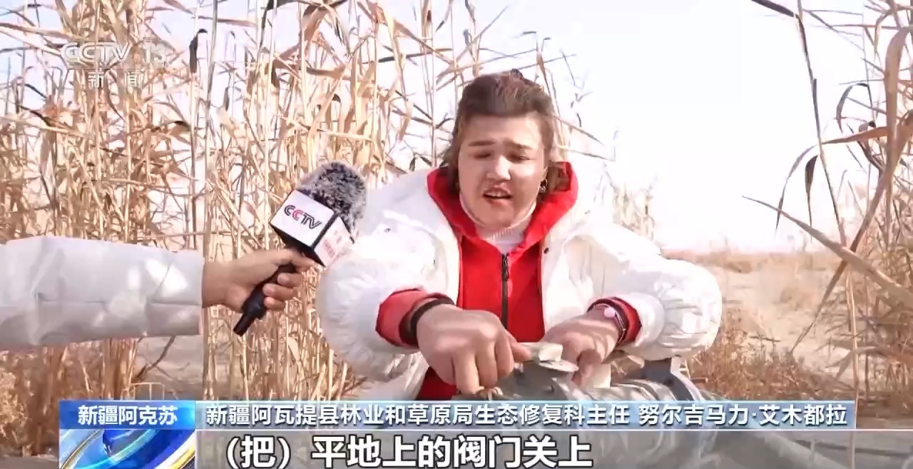 新疆阿瓦提县林业和草原局生态修复科主任努尔吉马力·艾木都拉:把平地上的阀门关上,然后把全部压力给到高处沙包上的滴灌管道。再生水来了,水源充足以后,现在成活率达到75%以上了。