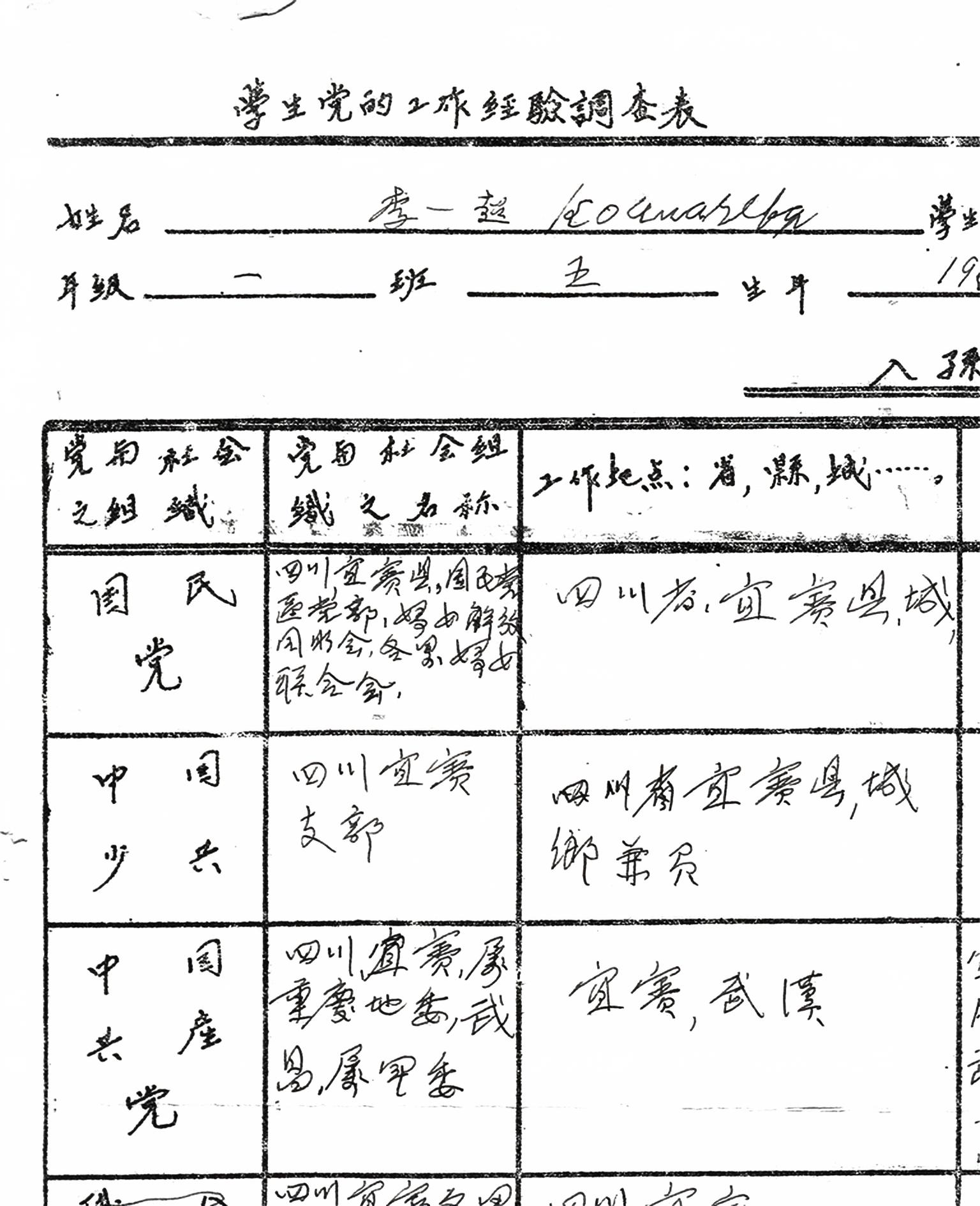 赵一曼在莫斯科中山大学留学期间填写的调查表