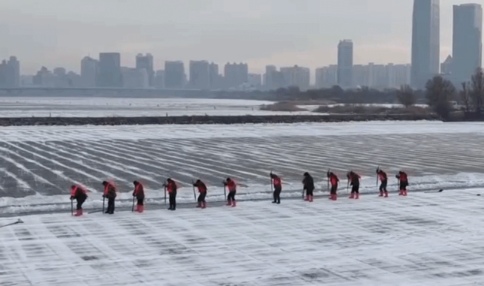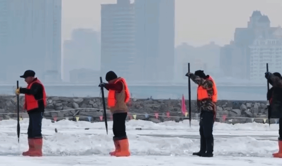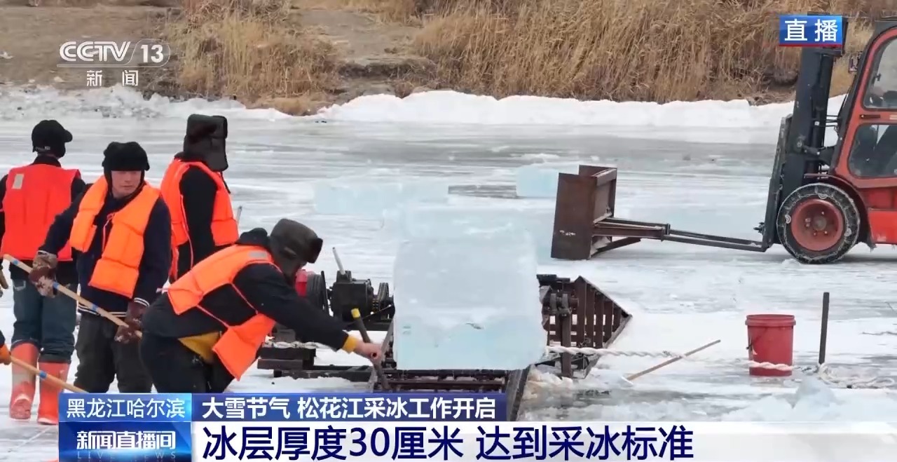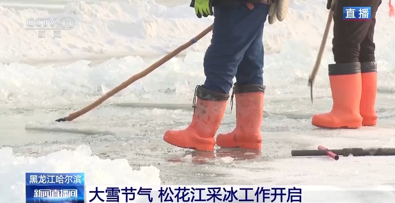 都说“小雪封地,大雪封河”,冰封的松花江上,冰面厚度已经达到了30厘米,符合采冰作业标准,这个厚度可以承载采冰队伍作业,采上来的冰块也更适合做冰雕建筑。