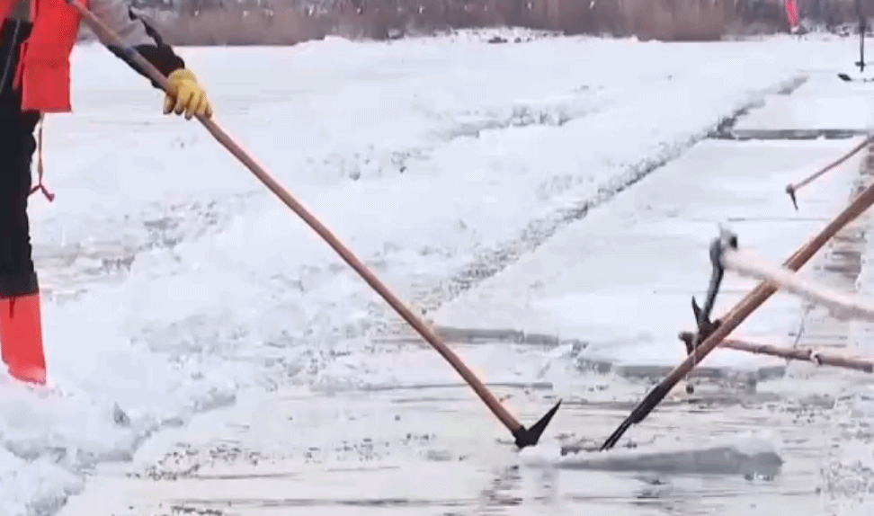 “一切”指的是划线切割,这是采冰前的准备工作,需要提前几天进行。采冰工人将冰面画成80厘米×160厘米的格子,然后切割。切割主要有两个作用,一是为了后期方便将冰块分开,二是让冷空气可以更多地进入冰面内部,加速结冰速度。