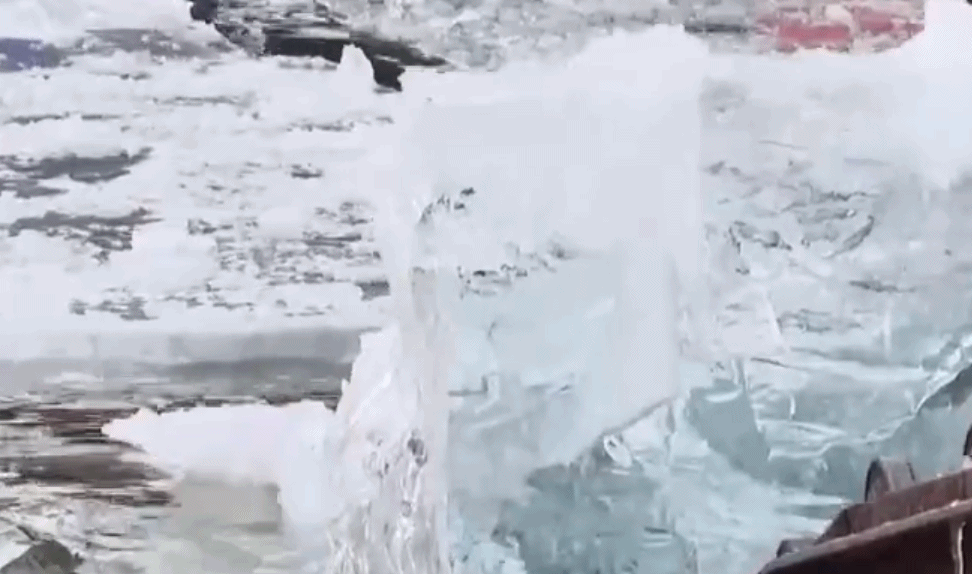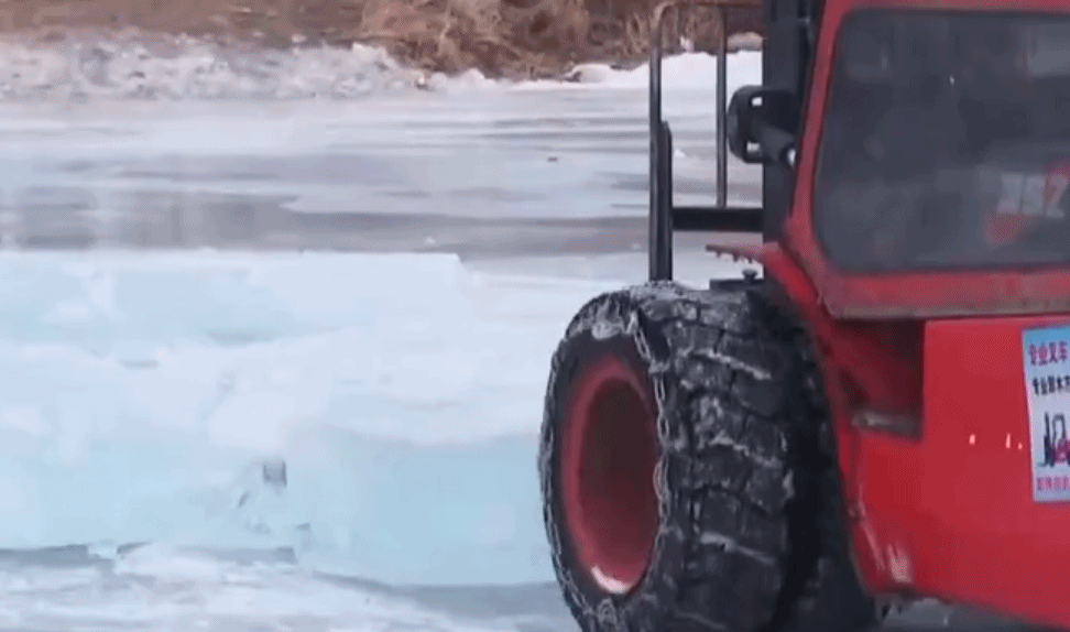 一块块晶莹剔透的江冰正在出水,有人站在冰面上分冰,有人站在传送带旁钩冰,还有人要拽紧安全绳来防止浮冰漂走。然后一块块冰顺着传送带一滑就到了岸边,再由叉车驾驶员把这冰装到车里运走。