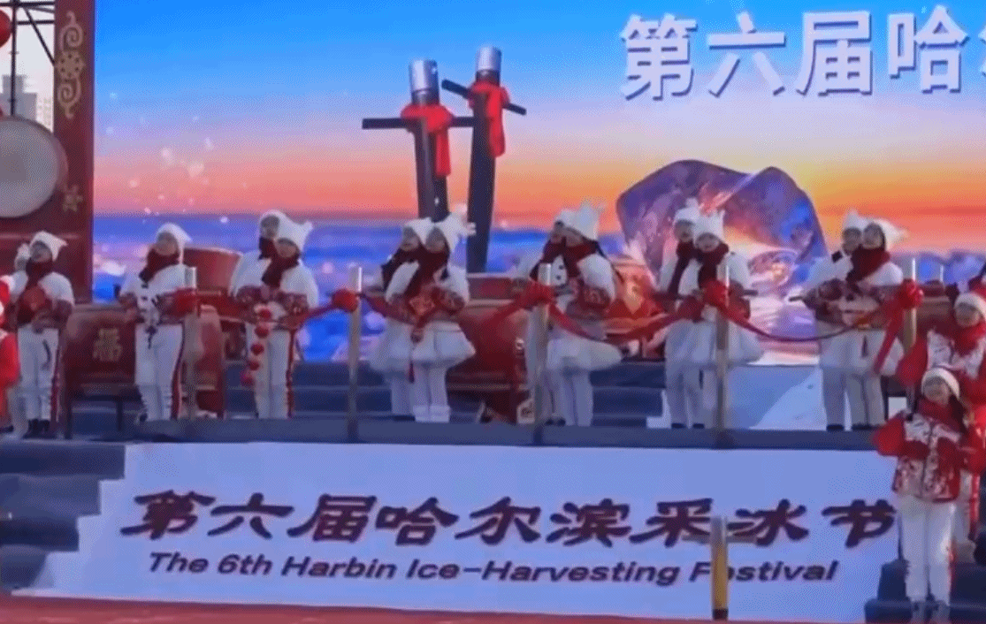 松花江采冰的启动对于哈尔滨这座城市来说,也成了一个重要的节日,就在距离采冰场不远的地方,今天第六届哈尔滨采冰节在松花江畔隆重启幕。