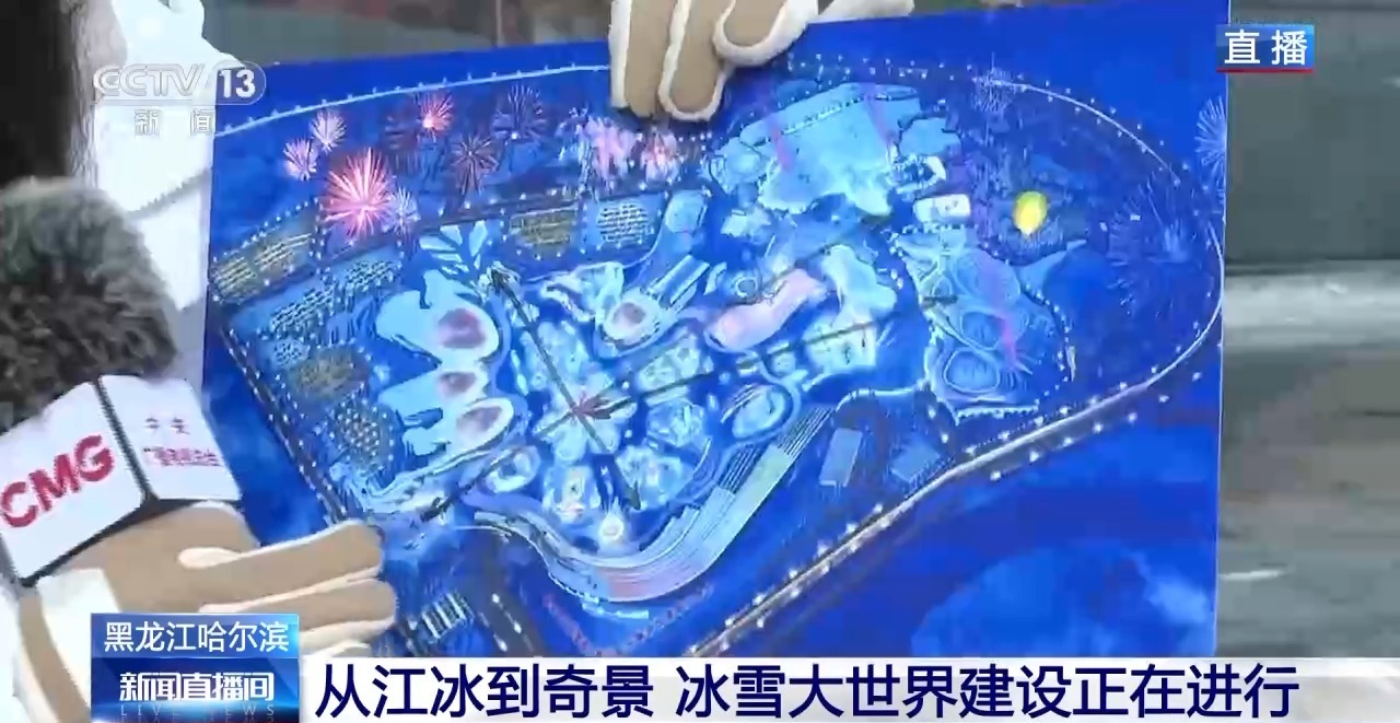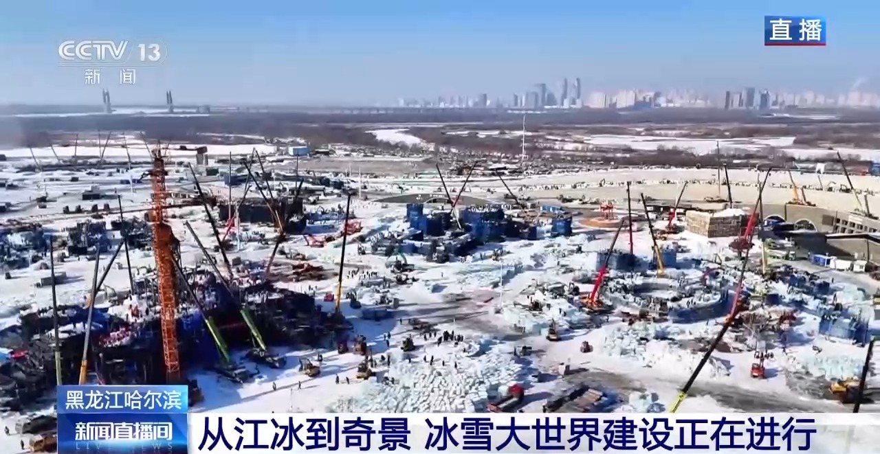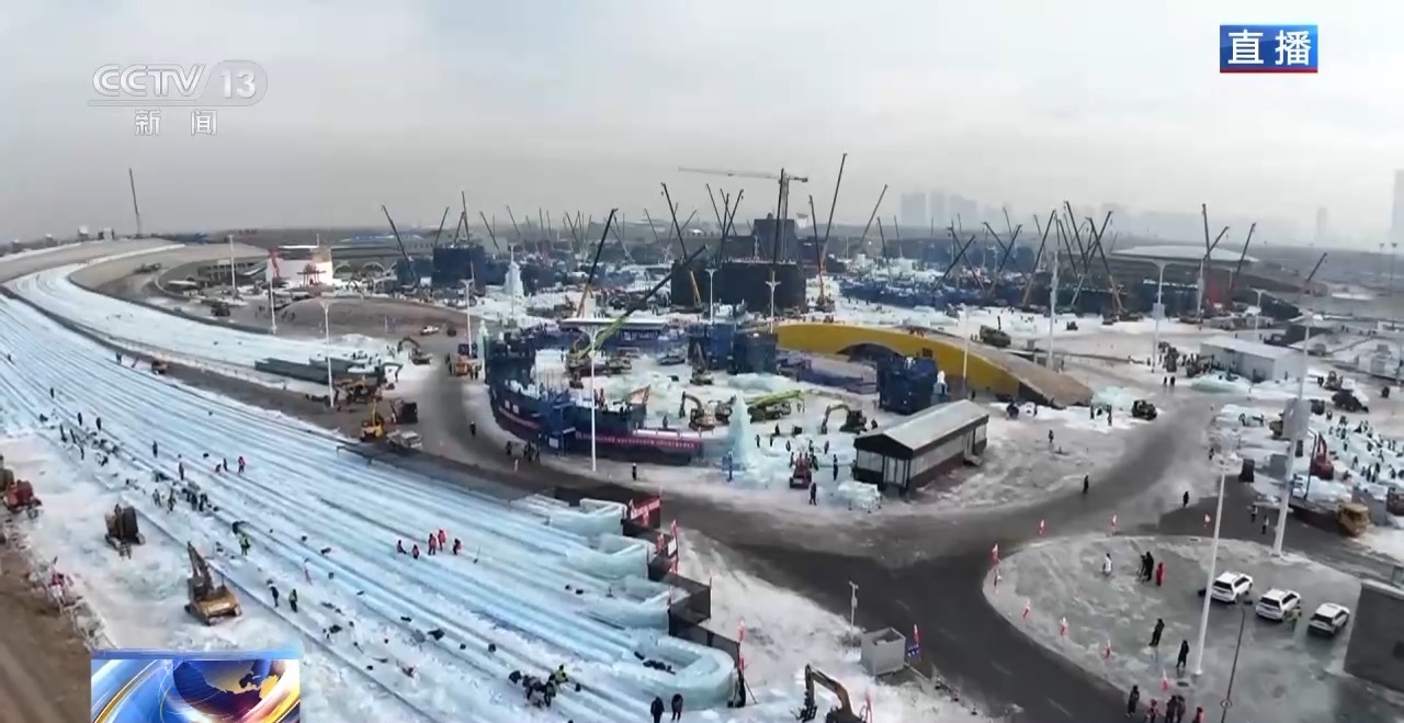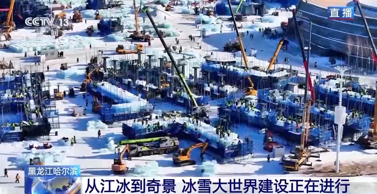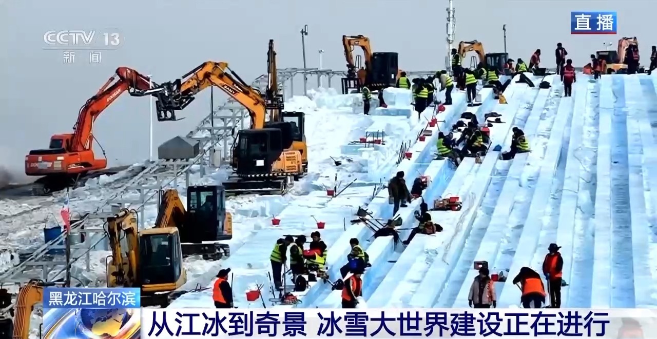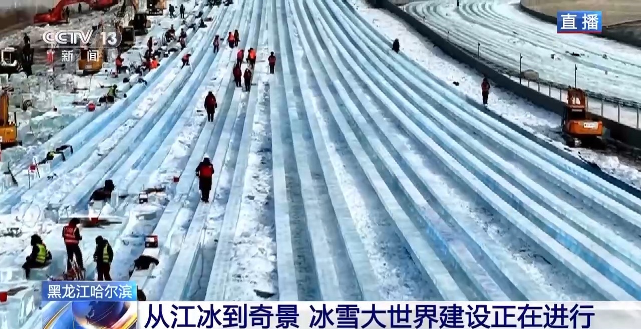 从松花江里采出来的巨大冰块,所要运往的终点,就是第二十七届哈尔滨冰雪大世界的建设现场,成为这些美丽冰雕的原材料。园区最受欢迎的人气项目——超级冰滑梯,工人们正在加紧进行精细化打磨和安装。