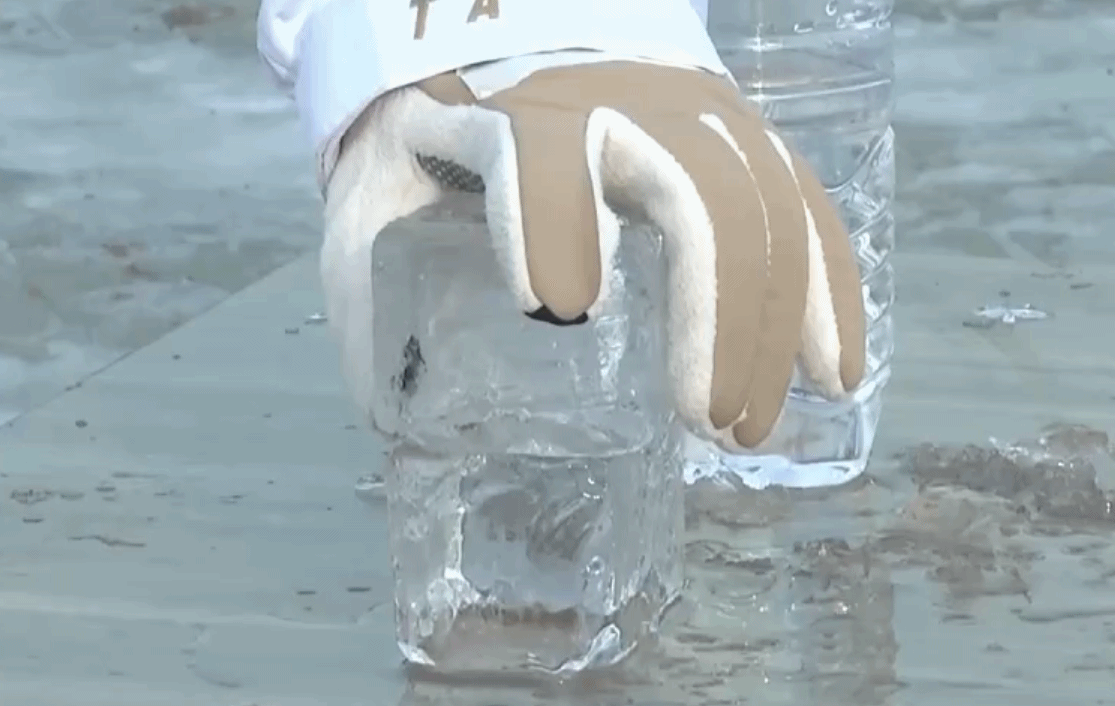 记者通过在冰砖的表面浇上冷水,接着迅速将另一块冰砖按压上去,只需要几秒钟的时间,两块冰就这样牢牢地“长”在一起了。
