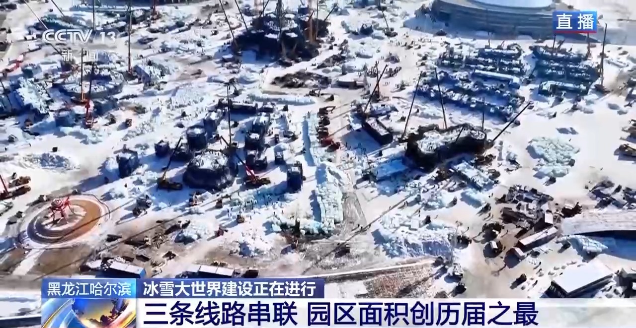 通过航拍镜头视角可以看到,整个冰雪大世界园区非常壮观,所有的冰建项目都已经开工。