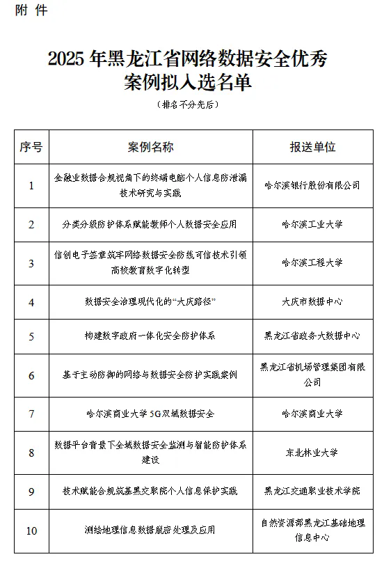 附件:2025年黑龙江省网络数据安全优秀案例拟入选名单