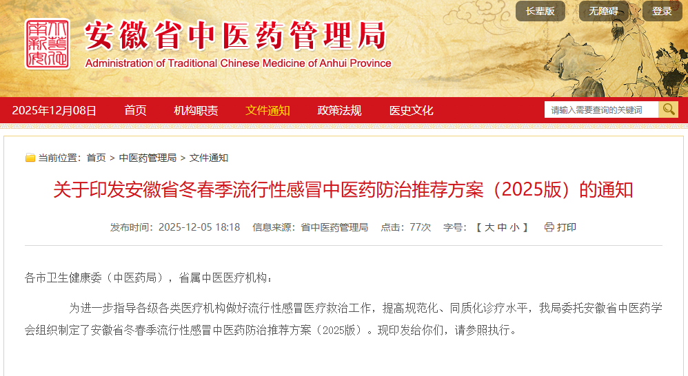 近日,安徽省中医药管理局印发《安徽省冬春季流行性感冒中医药防治推荐方案(2025版)》。该方案密切结合安徽省气候特点、流感流行特征和人群主要证候,为应对流感提供中医药防治参考。