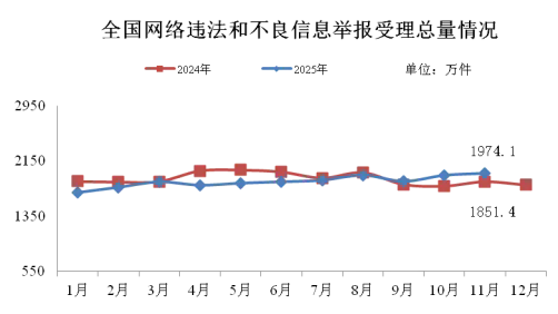 2025年11月,中央网信办举报中心指导全国各级网信举报工作部门、主要网站平台受理网民举报色情、赌博、侵权、谣言等违法和不良信息1974.1万件,环比增长1.5%、同比增长6.6%。其中,中央网信办举报中心受理举报49.9万件,环比增长39%、同比增长27.3%;各地网信举报工作部门受理举报70.8万件,环比下降46.2%、同比下降47.6%;全国主要网站平台受理举报1853.4万件,环比增长4.2%,同比增长10.5%。
