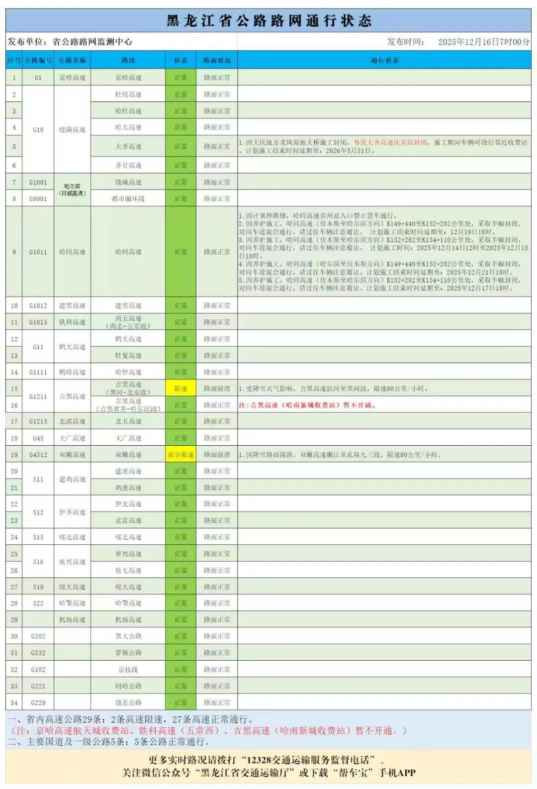 12月16日7时汇总路况信息:限速的高速有(2条高速):吉黑高速(黑河-北安段)、双嫩高速(嫩江至农垦九三站),限速80公里/小时。省内其它高速路况正常。