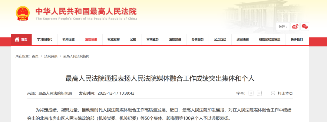 近日,最高人民法院印发通报,对在人民法院媒体融合工作中成绩突出的50个集体、100名个人予以通报表扬。其中,黑龙江1个集体、3名个人入选。