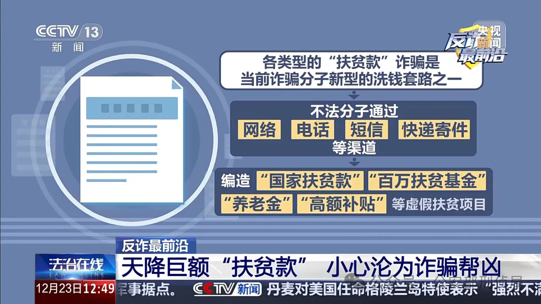 目前,各类型的“扶贫款”诈骗是当前诈骗分子新型的洗钱套路之一,不法分子通过网络、电话、短信、快递寄件等渠道,编造“国家扶贫款”“百万扶贫基金”“养老金”、高额补贴等虚假扶贫项目。