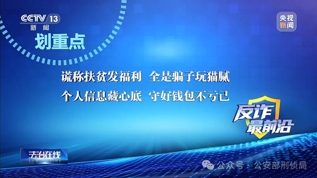 反诈最前沿,我们一起来划重点:谎称扶贫发福利,全是骗子玩猫腻。个人信息藏心底,守好钱包不亏己。