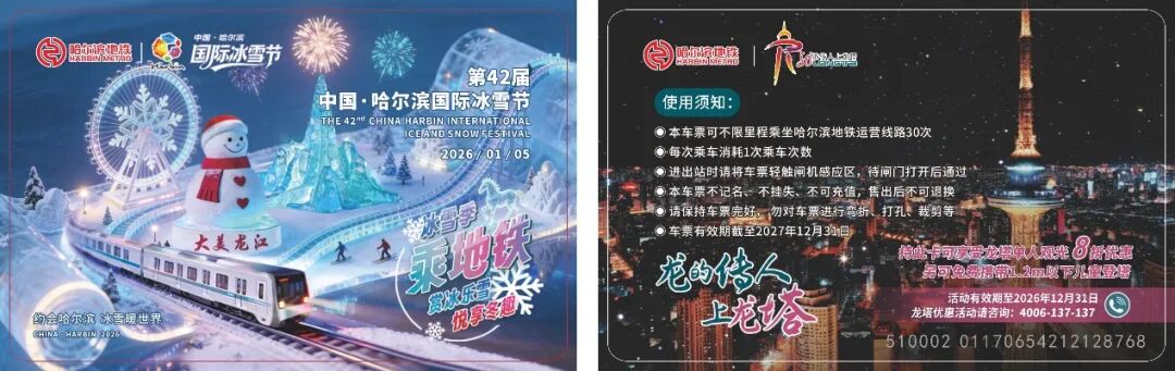 第42届中国·哈尔滨国际冰雪节将于2026年1月5日正式开幕,值此冰雪盛会之际,哈尔滨地铁携手龙塔发行冰雪节·龙塔主题纪念票。本次车票将在2026年1月3日(周六)开始发售,欢迎广大乘客朋友前往发售车站购买。
