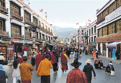 西藏拉萨八廓街上游人如织。