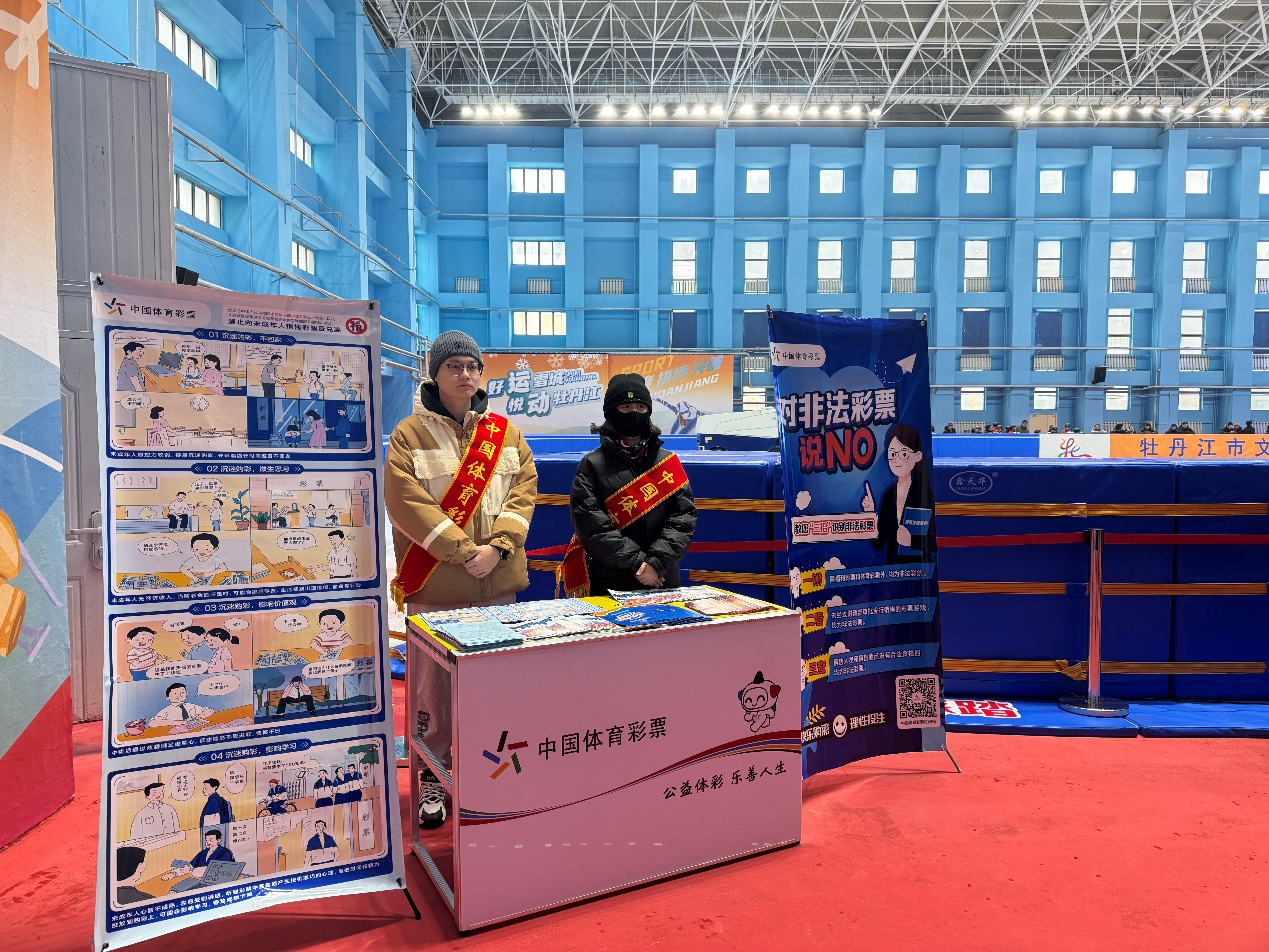 在速滑表演风驰电掣、冰球对决攻防转换的热烈氛围旁,牡丹江市体彩中心设置的责任彩票宣传区,如同一处温暖的“公益驿站”。宣传台上,《彩票管理条例》解读清晰,理性购彩倡议醒目,“禁止向未成年人销售彩票及兑奖”的提示牌尤为显眼。工作人员与市民亲切交流,耐心讲解非法彩票的危害,强调“互联网是违法违规的体育彩票购买渠道”,引导公众树立健康、理性的购彩观念,自觉对非法彩票说“不”。这份对责任的郑重宣示,与赛场上的拼搏精神相互映照,共同诠释着健康、积极的社会风尚。