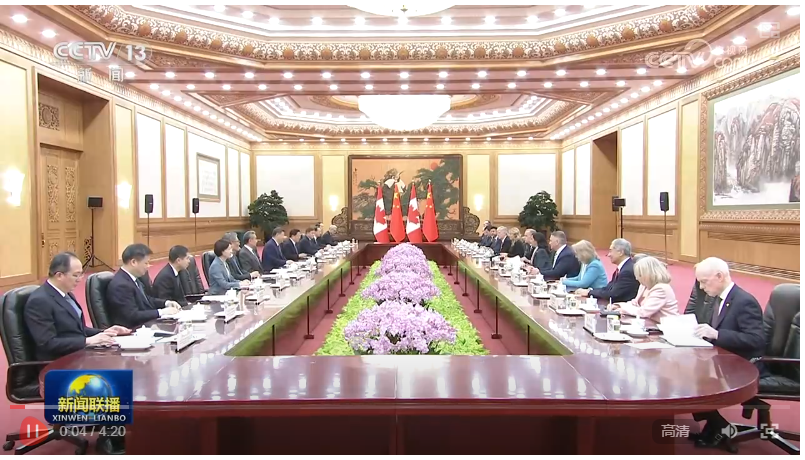 1月16日上午,国家主席习近平在北京人民大会堂会见来华进行正式访问的加拿大总理卡尼。