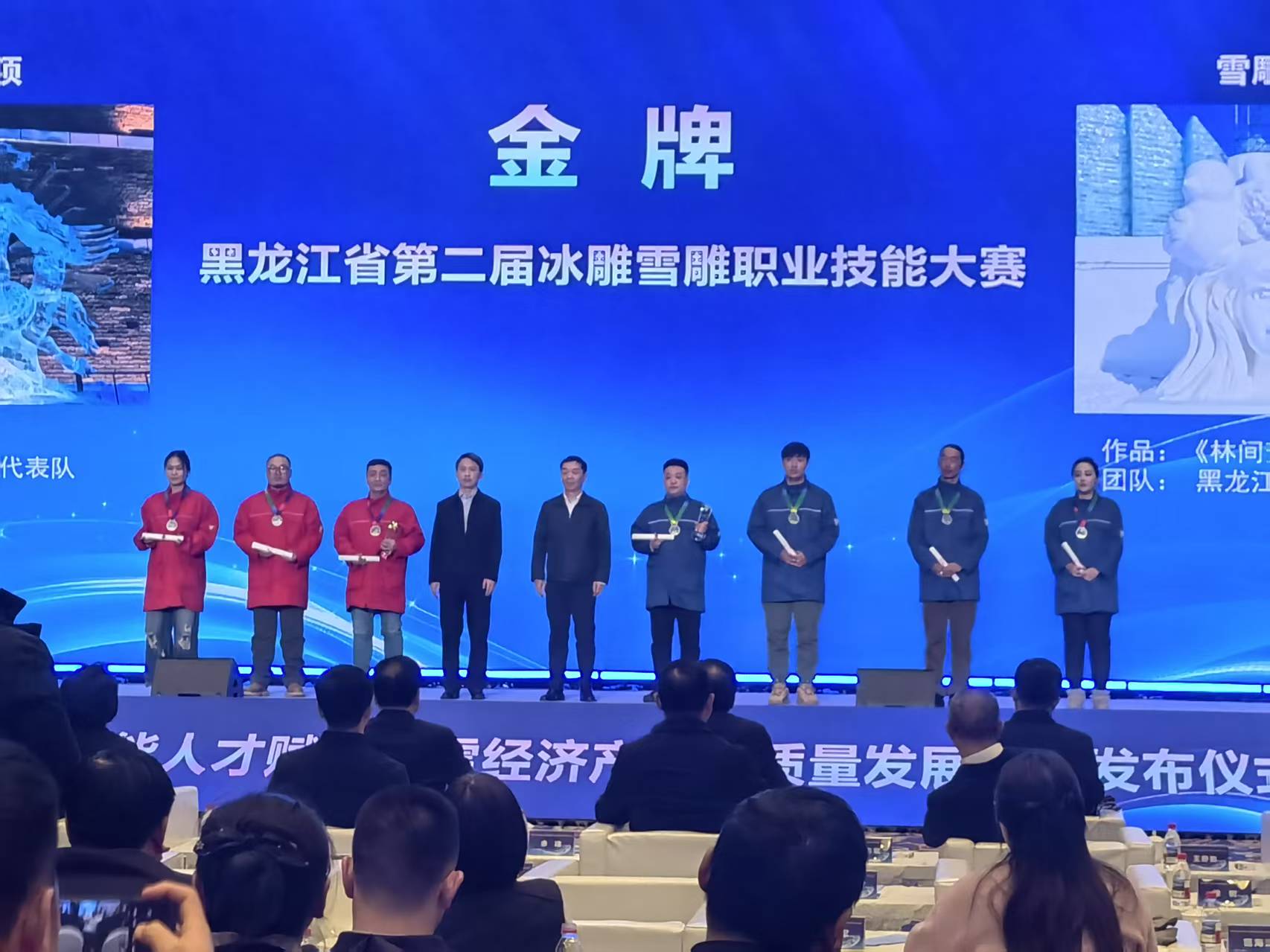 1月23日,黑龙江省技术技能人才赋能冰雪经济产业高质量发展成果发布仪式在哈尔滨举行,正式启动“冰雪振兴龙江技能照亮前程”专项行动,为冰雪经济领域5名“龙江大工匠”、8名“龙江技术能手”、5名“黑龙江省首席技师”颁发荣誉证书,并为黑龙江省第二届冰雕雪雕职业技能大赛的获奖人员颁奖。省直有关部门、行业企业、院校相关负责人及技能人才代表参会。