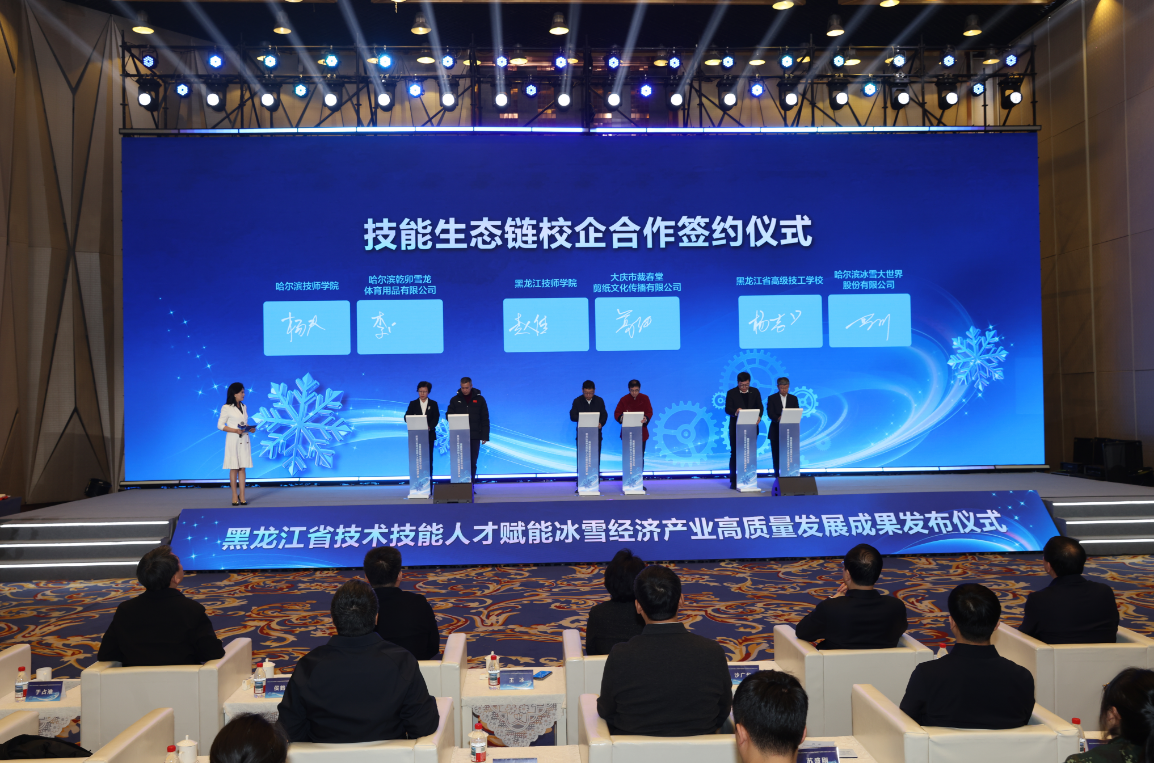 发布仪式上,同步推出一系列支撑举措,成立黑龙江省冰雪经济产业学院,组建冰雪装备、冰雪运动、冰雪文化、冰雪旅游4个产教评技能生态链并签订校企合作协议;发布15项冰雪经济领域专项职业能力考核规范和培训项目机构名录;组建东北三省一区冰雪经济领域技能大师工作室联盟,创新打造“技师+工程师”团队协作模式。