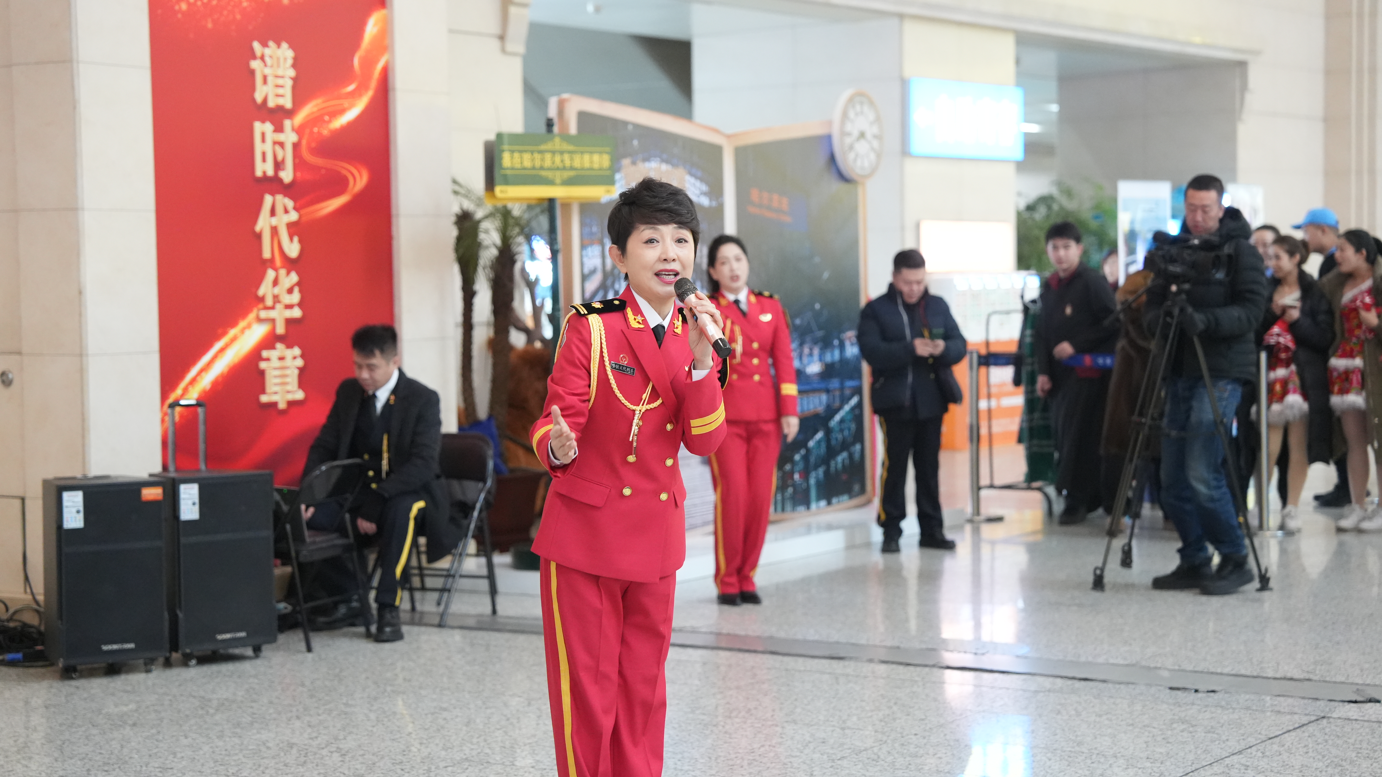 当悠扬的旋律突然在候车室响起,“春运快闪·冰雪歌舞秀”准时上演。哈尔滨站特别邀请哈铁文工团、哈尔滨芭蕾舞团艺术团的演员们,带来了一场沉浸式冰雪主题表演。灵动的冰雪舞蹈展现着北国风光的灵动之美,悠扬的器乐演奏传递着新春佳节的喜庆氛围,演员们与旅客近距离互动,不少孩子跟着节奏拍手起舞,现场气氛被推向高潮。“没想到候车还能看到这么精彩的表演,感觉旅途都变得温暖起来。”准备返乡的王先生感慨道。据了解,参演演员中不乏哈尔滨站的职工,他们利用休息时间精心排练,用实际行动为旅客的回家路增添暖意。